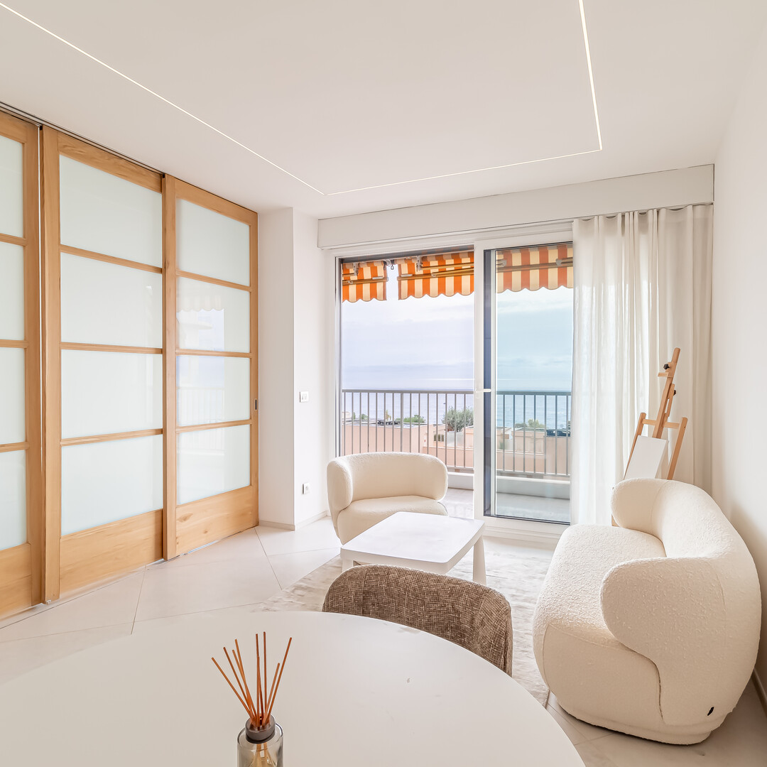 Completamente ristrutturato, questo luminoso bilocale si apre su un ingresso che conduce ad un accogliente soggiorno ampliato da una terrazza con vista mare. La cucina a vista, attrezzata con cura, accompagna soggiorni luminosi e funzionali. La camera da letto ha un facile accesso al ripostiglio, completato da un elegante bagno con doccia e servizi igienici per gli ospiti. Le finiture contemporanee e la distribuzione dei fluidi rafforzano il comfort dell'insieme.