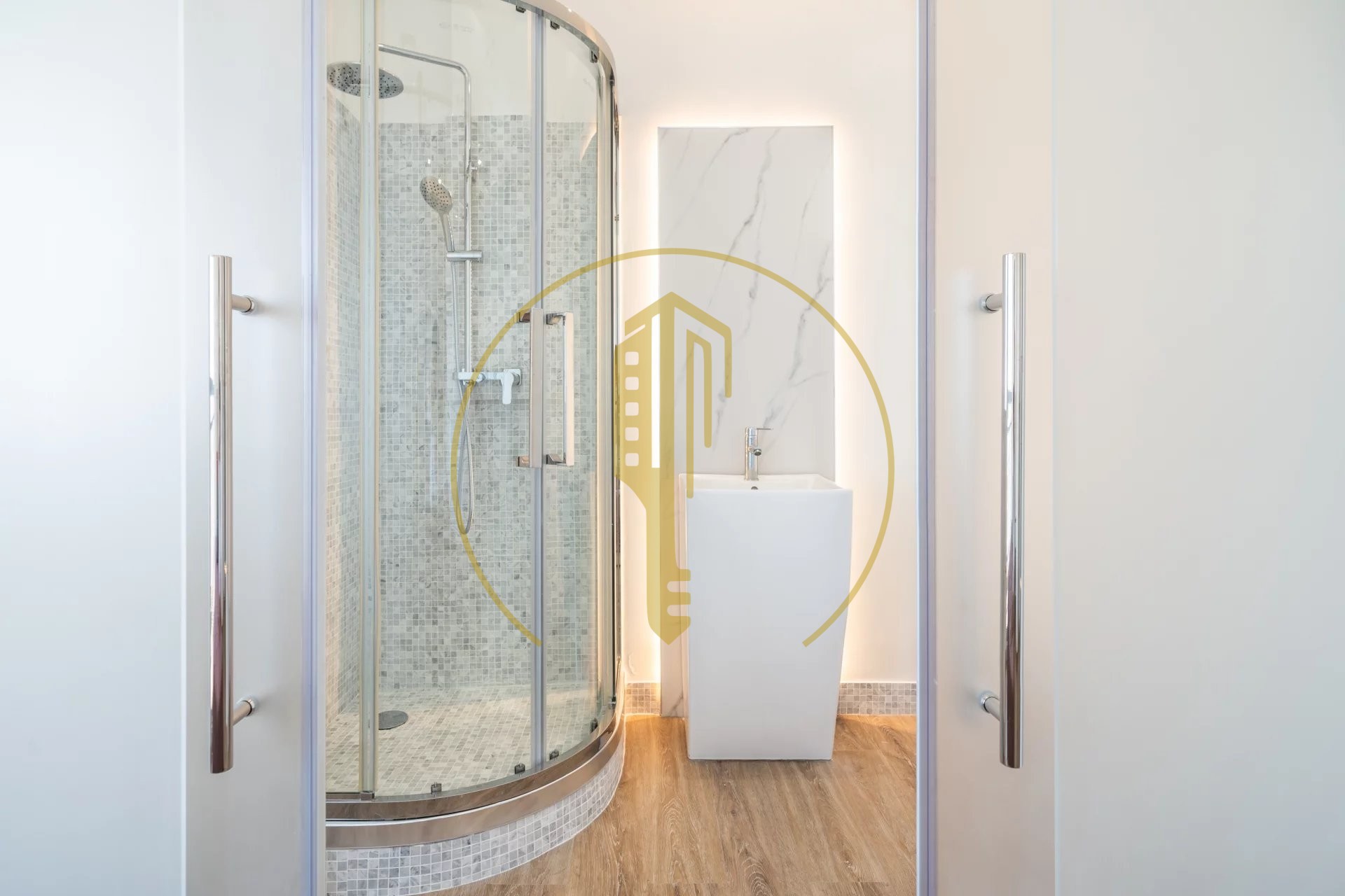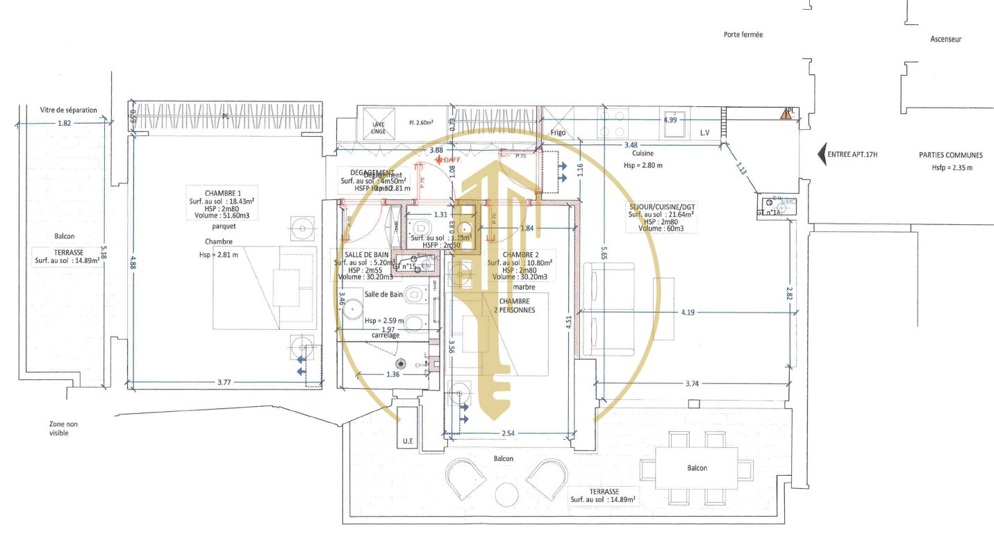 È composto da: un soggiorno con cucina attrezzata, due camere da letto ciascuna con bagno con doccia, un bagno per gli ospiti e molto spazio di archiviazione.