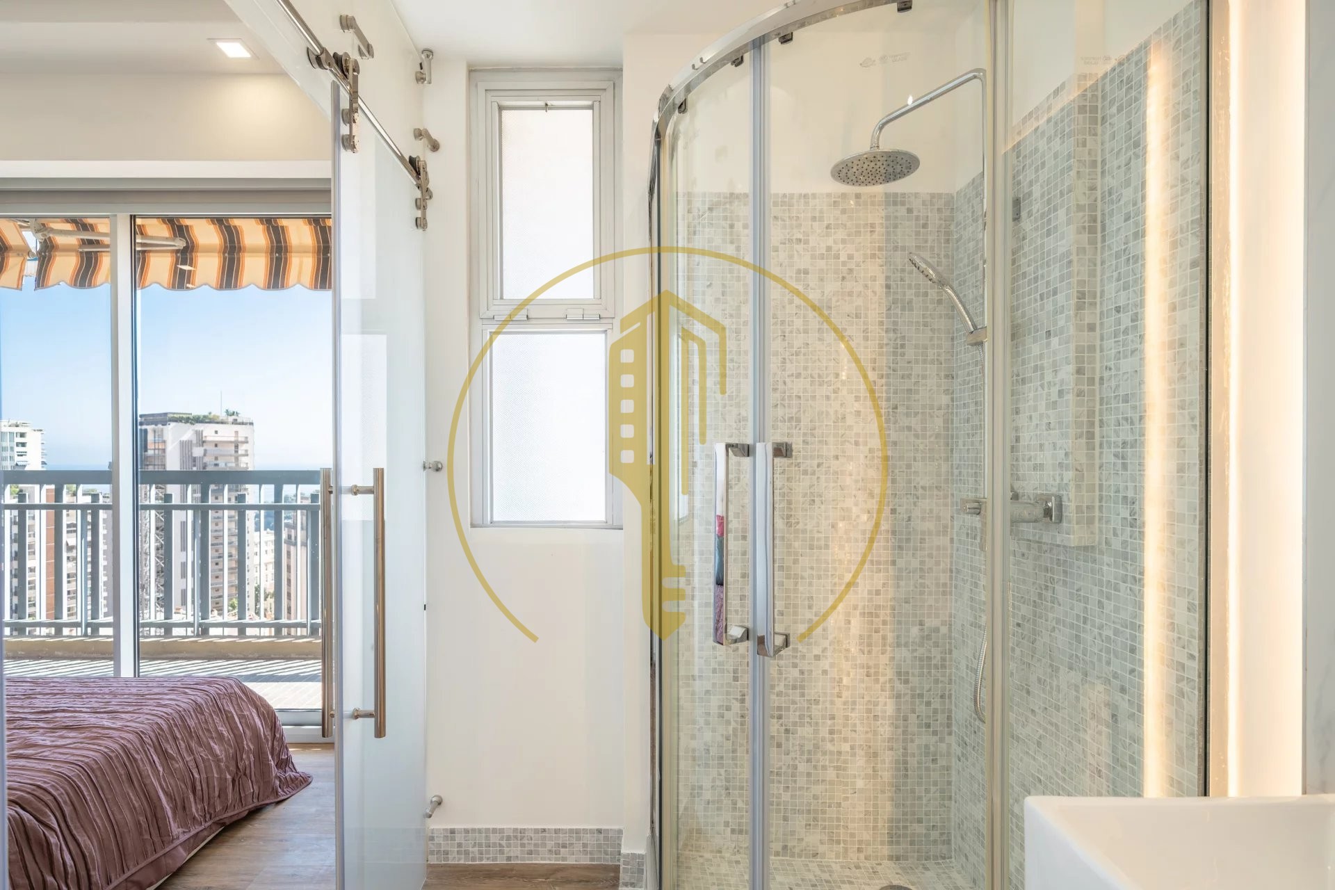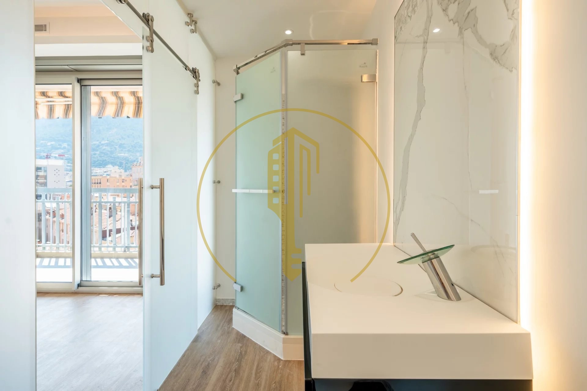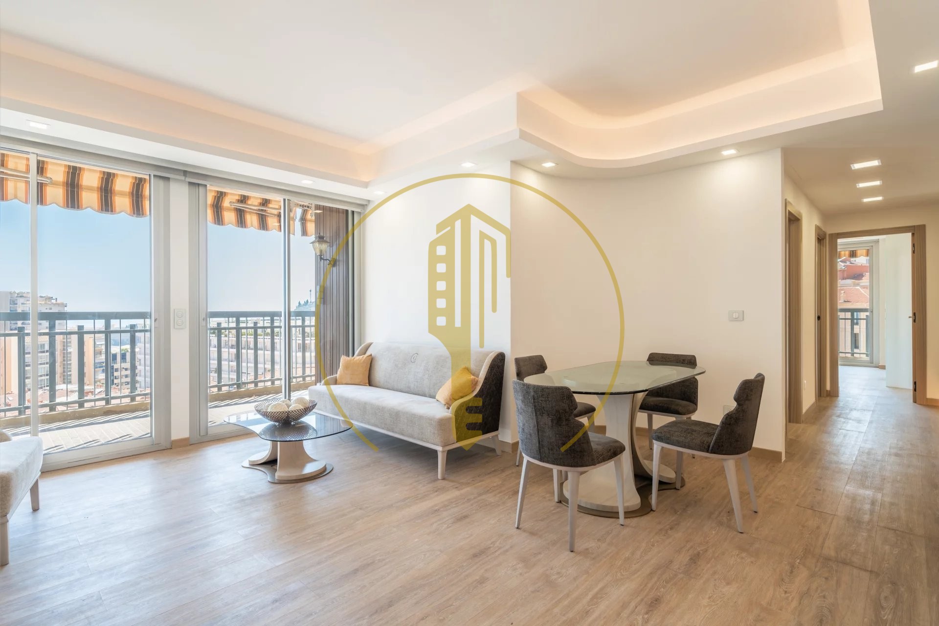Luminoso trilocale completamente ristrutturato situato all'8° piano con 95 m² di superficie abitabile e 23 m² di terrazze con vista sul mare e sulla città.