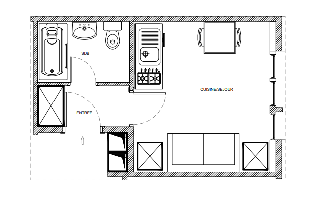 Si compone di: un ingresso con armadio, una stanza principale, una cucina non attrezzata, un bagno con doccia.
