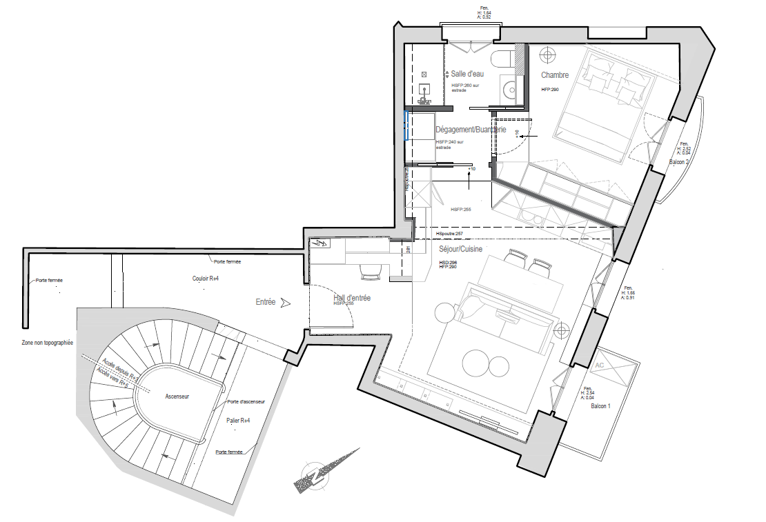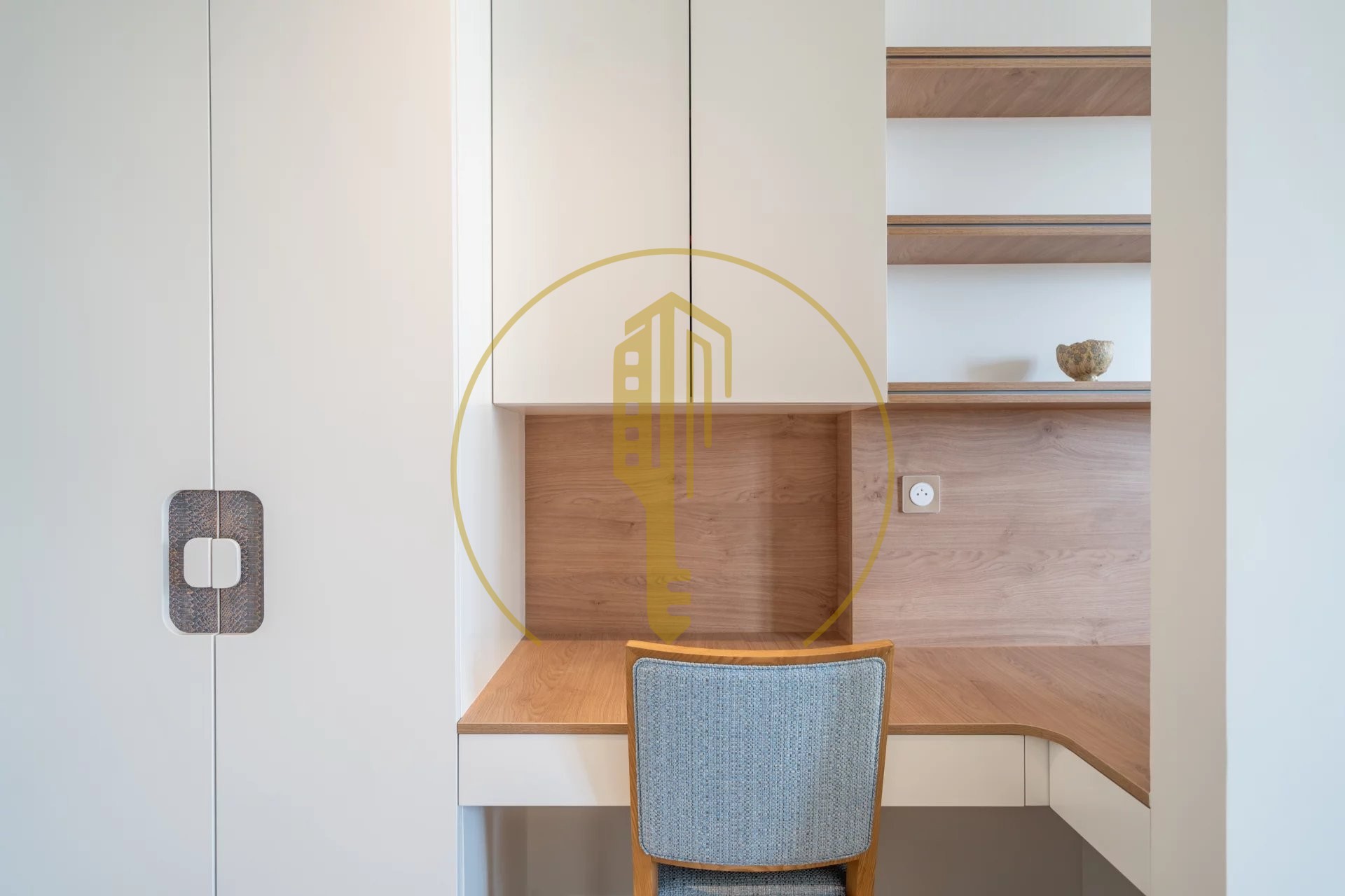 È composto da un ingresso con zona studio, un soggiorno che si apre su un balcone, una cucina attrezzata che si apre sul soggiorno, una camera da letto con numerosi armadi e un bagno con doccia.