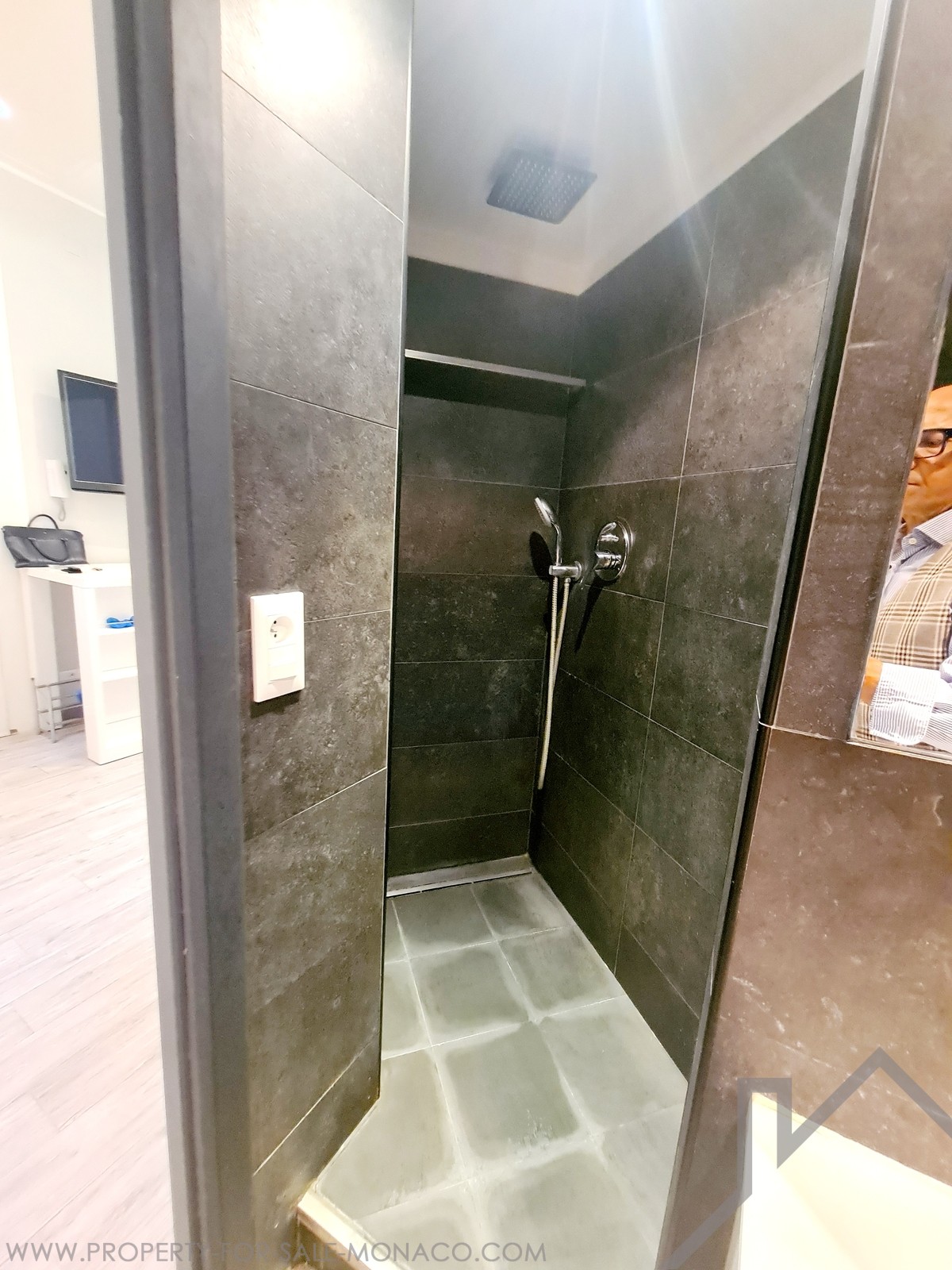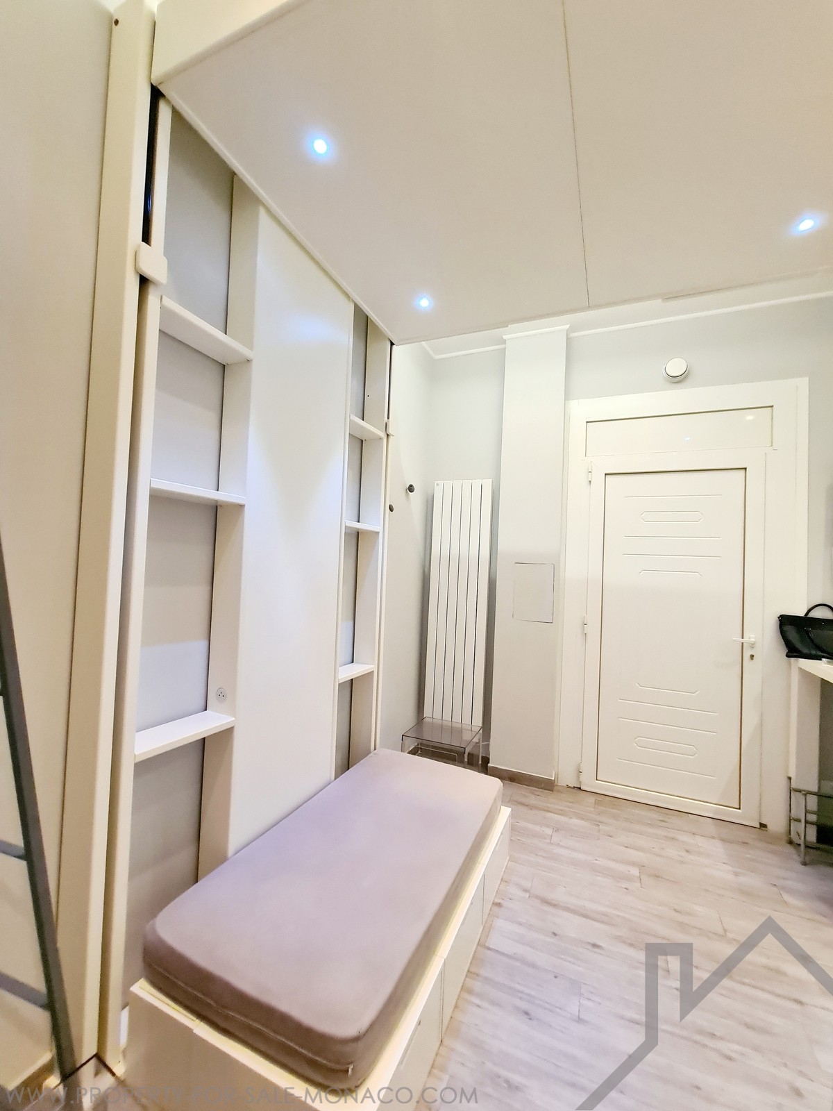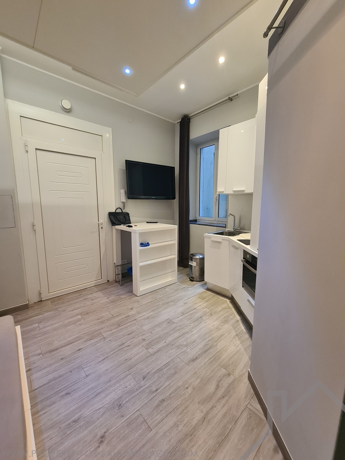 Monolocale sul retro dell'edificio (al 2° sottopiano) composto da una locale principale con angolo cottura, un bagno con wc. Arredato con mobili su misura, è il pied-à-terre perfetto per una persona