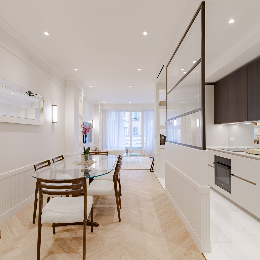 Questo elegante appartamento, completamente ristrutturato con materiali di alta qualità, unisce modernità e fascino borghese. Si compone di un ampio e luminoso soggiorno doppio con zona pranzo e una moderna cucina attrezzata con elettrodomestici integrati.