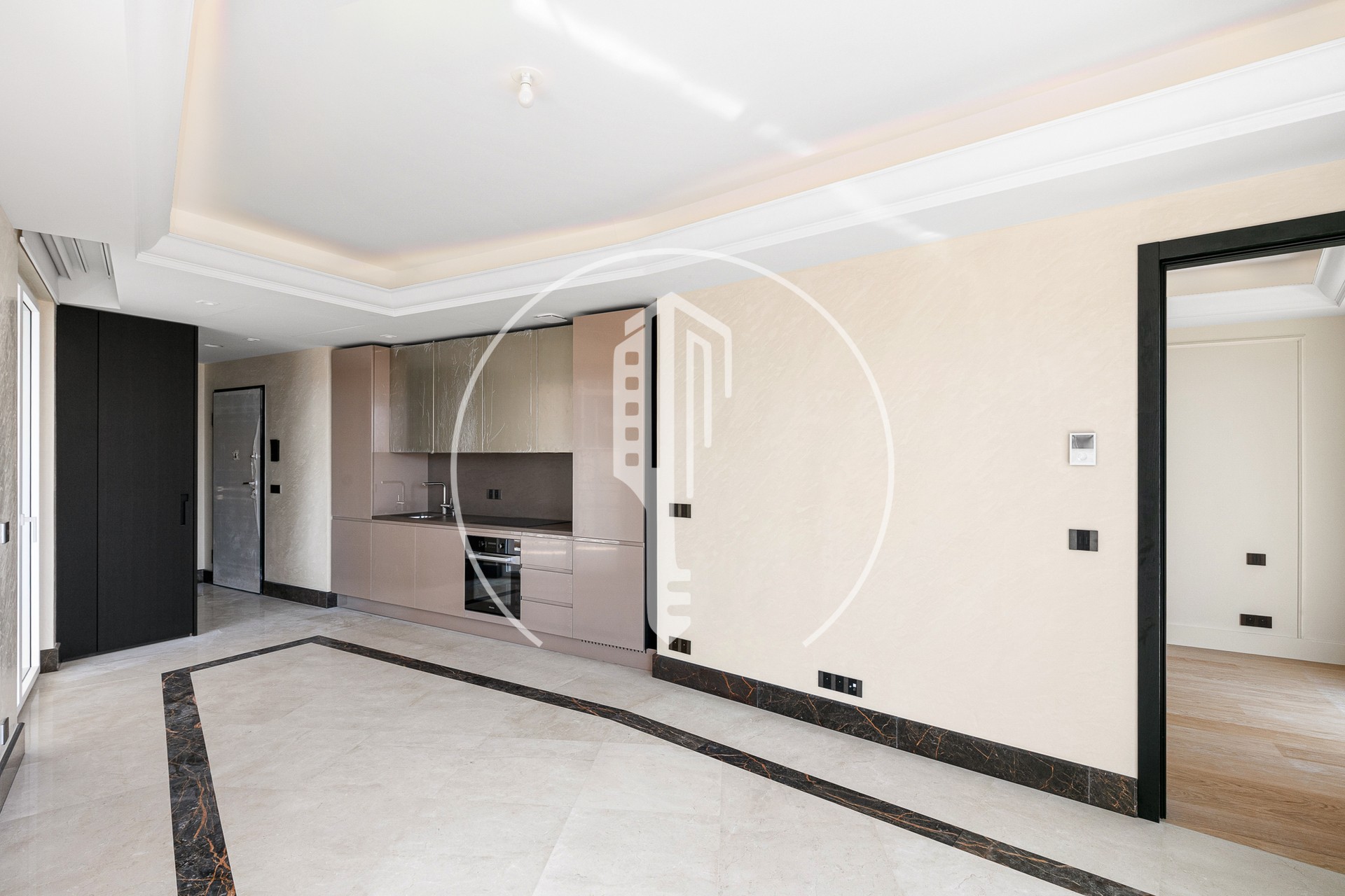 Rifinito in modo eccellente, l'appartamento comprende un ingresso con armadio a muro e illuminazione interna, una toilette per gli ospiti con specchio e lavabo su misura, un soggiorno luminoso e arioso con due diversi pavimenti in marmo, pareti in stucco e soffitto con cornici illuminate.