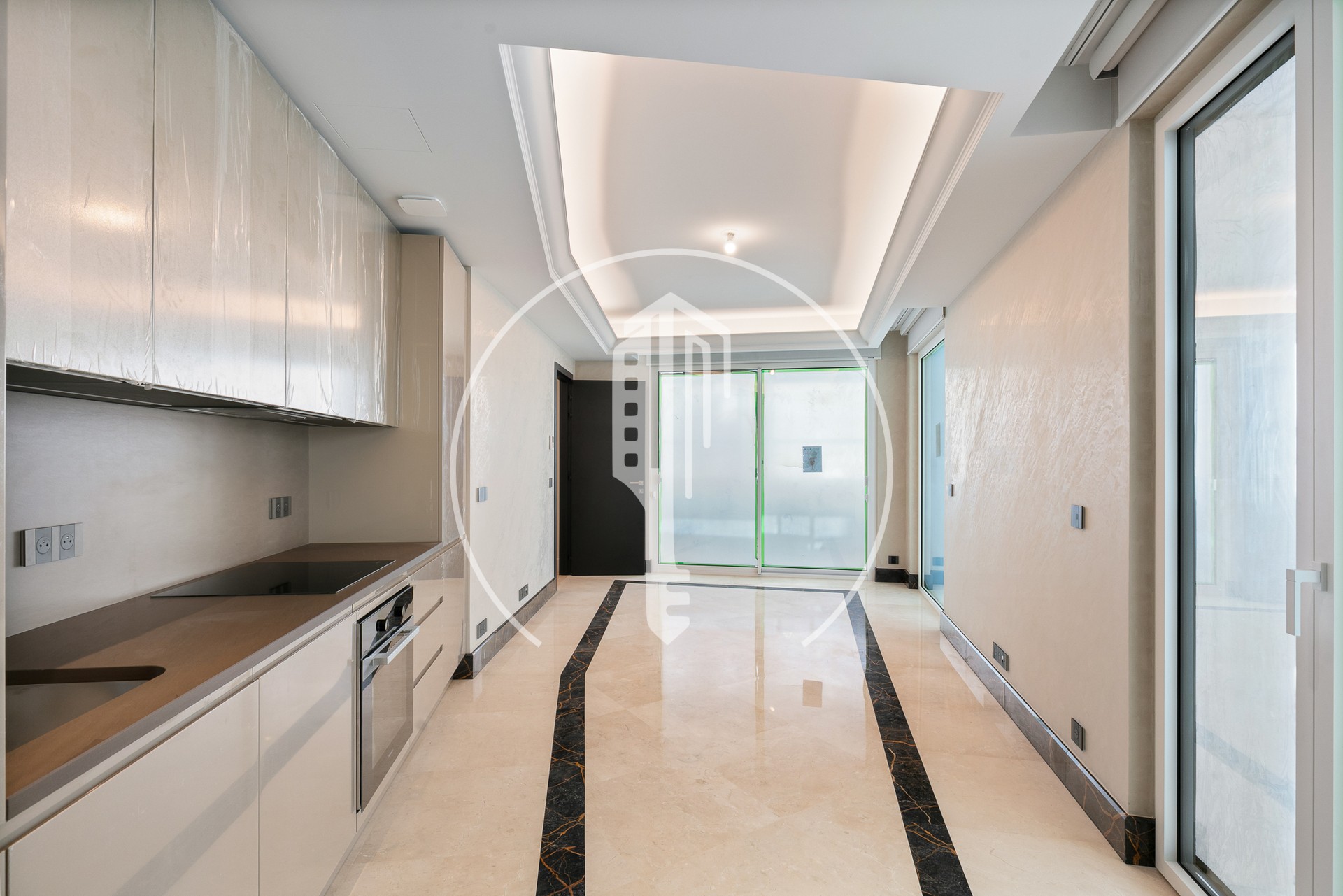 Il luminoso soggiorno ha due diversi pavimenti in marmo, pareti in stucco e un soffitto a cornice retroilluminato.
