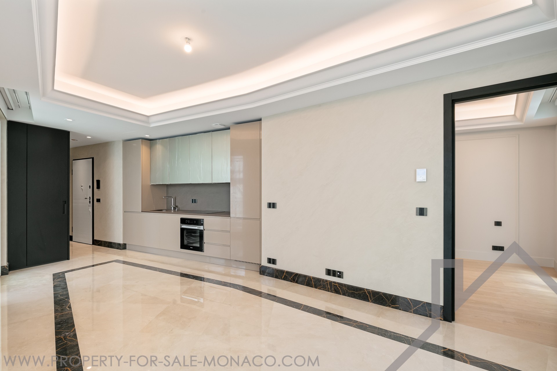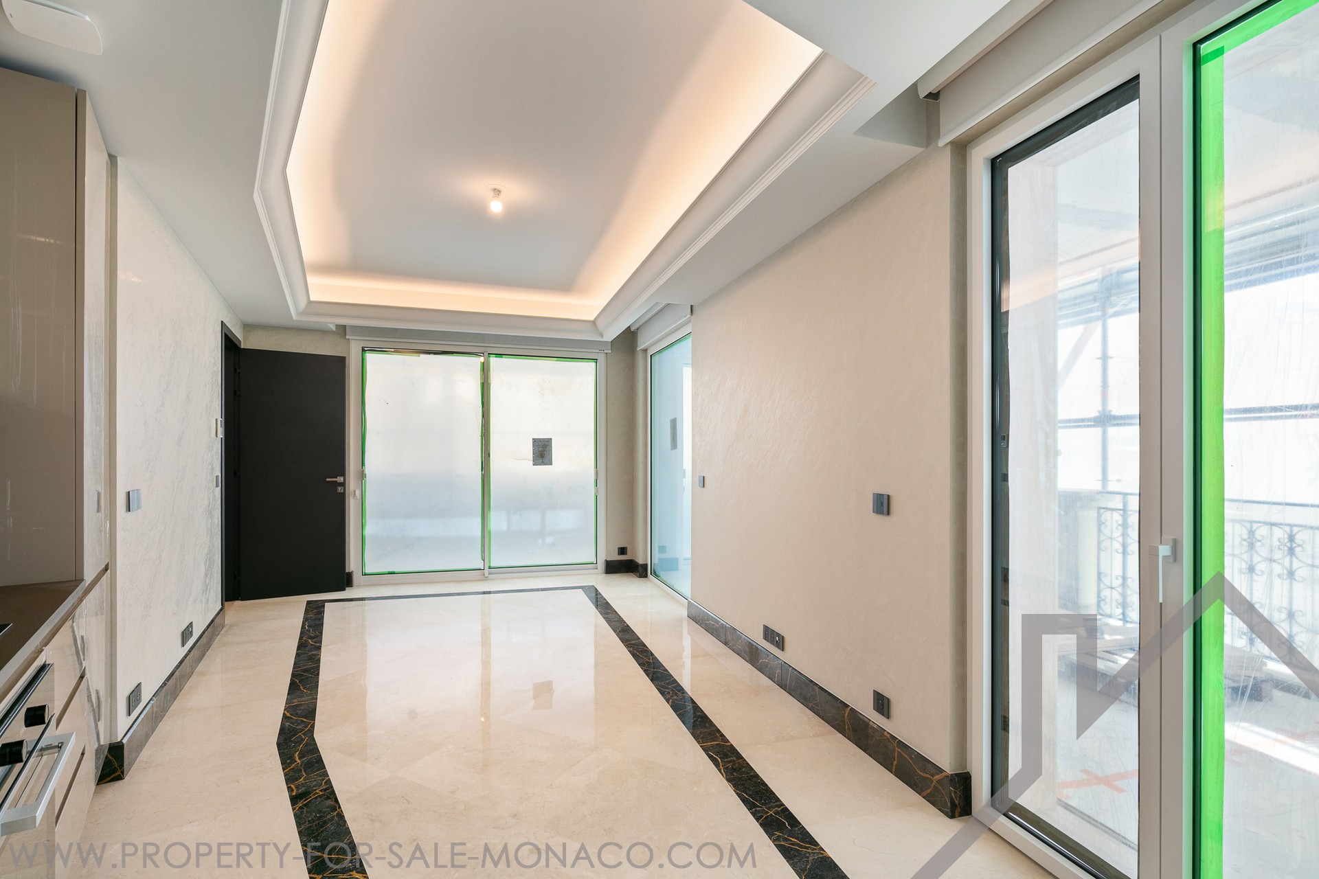 Il luminoso soggiorno ha due diversi pavimenti in marmo, pareti in stucco e un soffitto a cornice retroilluminato.