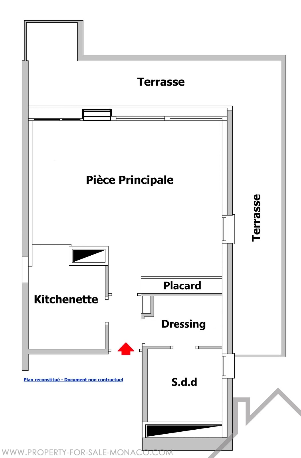 Ingresso, angolo cottura attrezzato, sala principale con armadio, spogliatoio, bagno con doccia, aria condizionata, doppi vetri, terrazza
