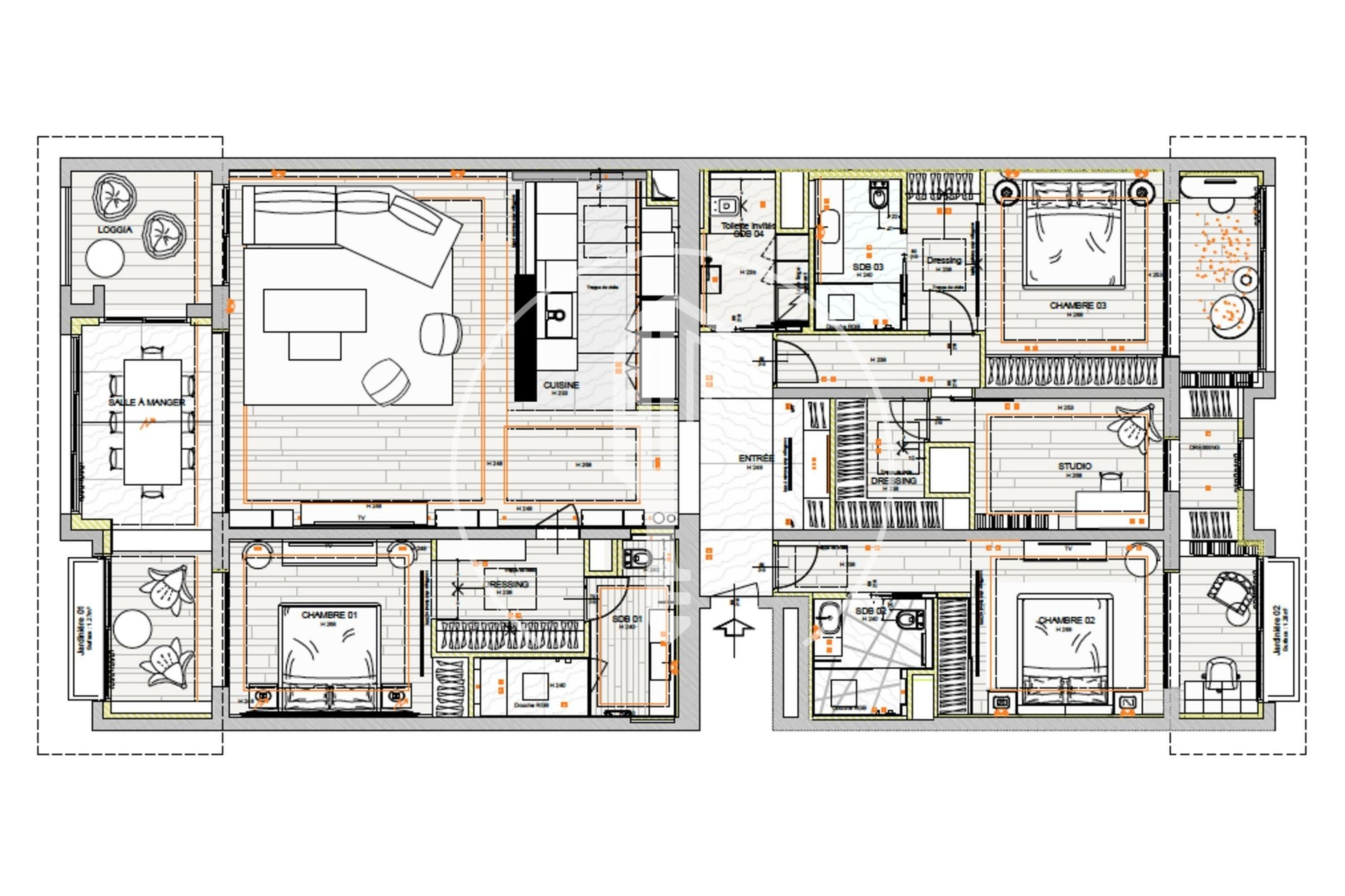 L’ingresso conduce ad un luminoso doppio soggiorno con zona pranzo, prolungato da una raffinata cucina a vista completamente attrezzata con elettrodomestici di alta gamma. Questo bellissimo spazio living si apre su una piacevole loggia con vista incantevole sui giardini e sul mare, ideale per vivere momenti di relax all’aria aperta. Un bagno ospiti.