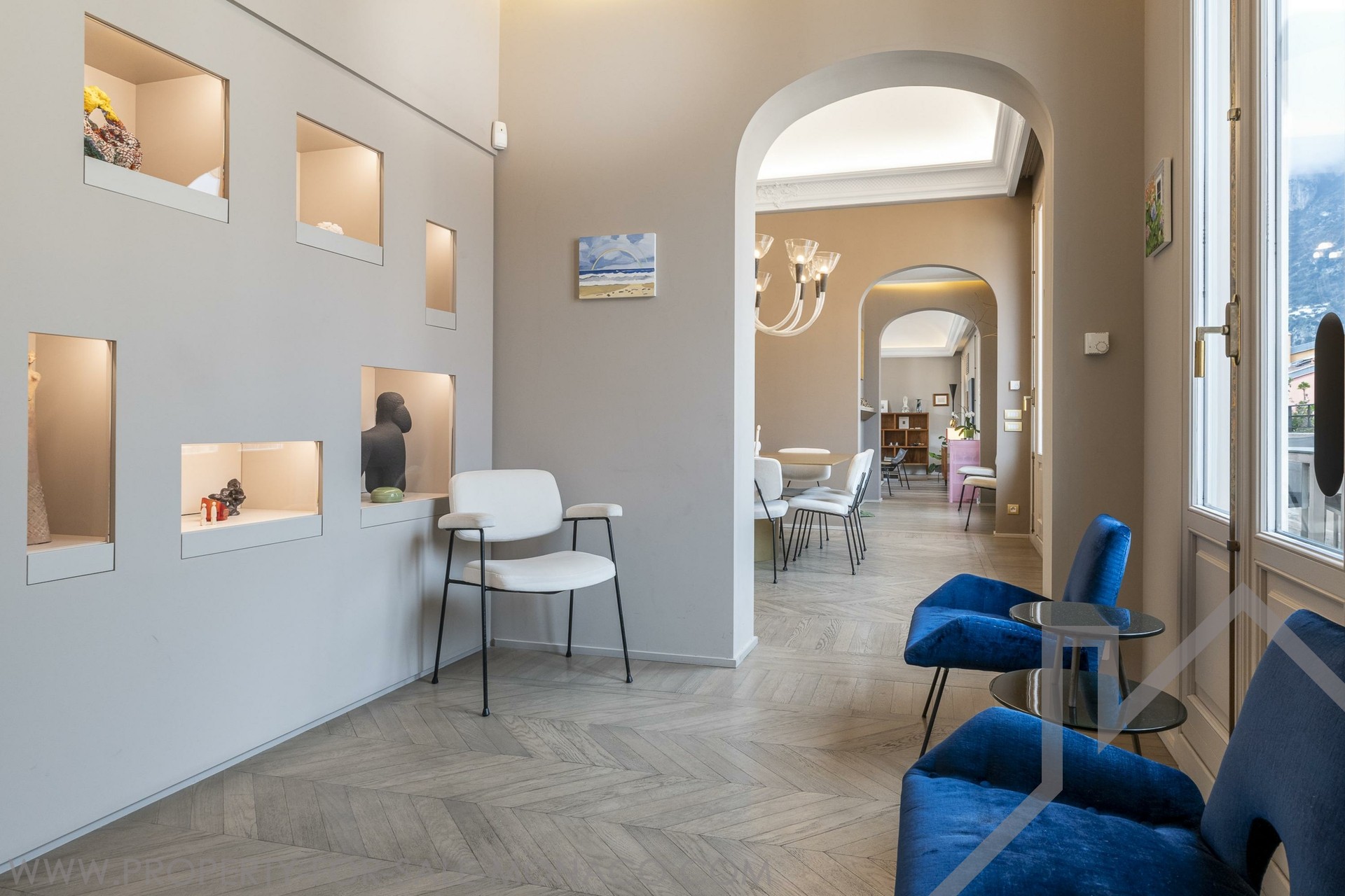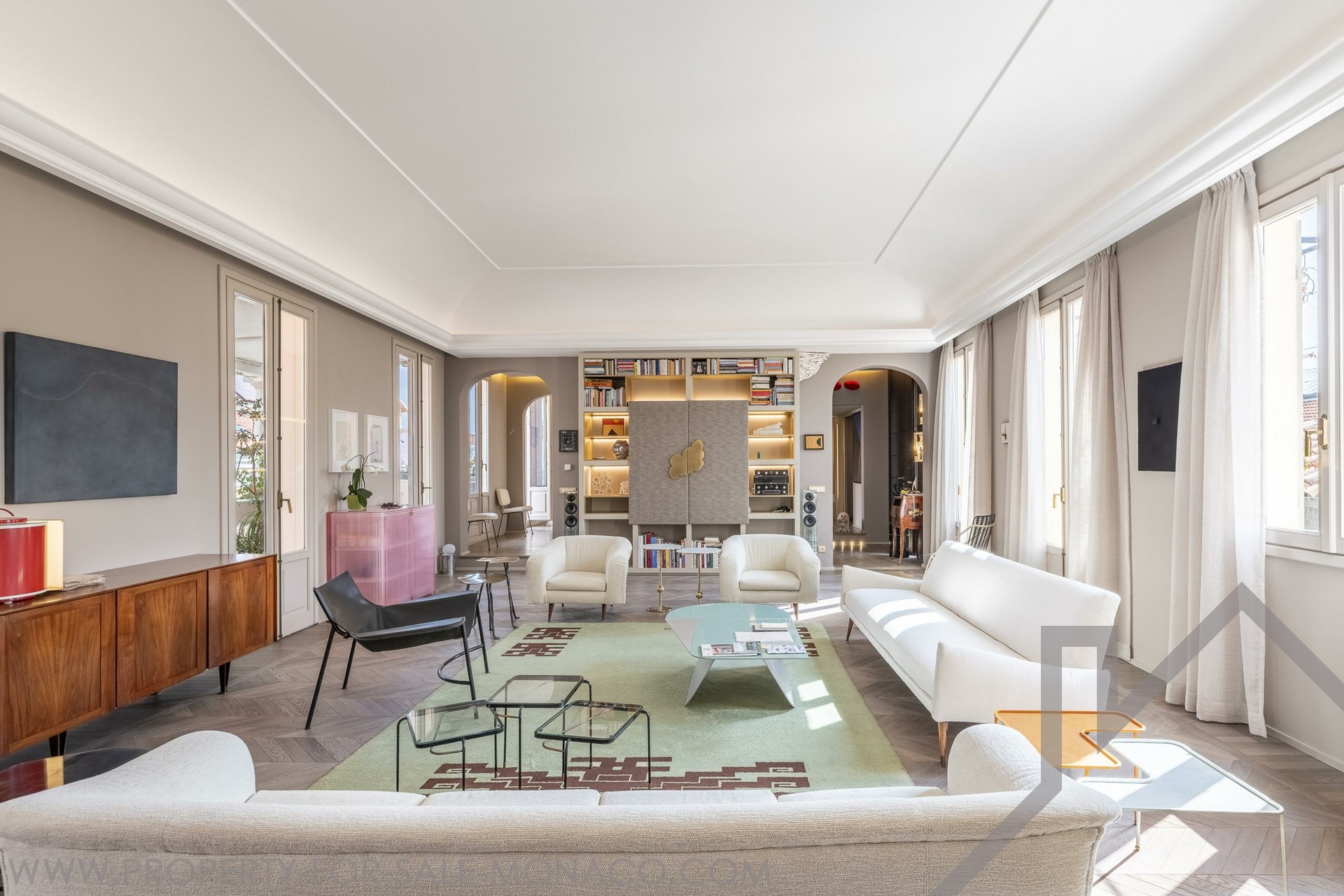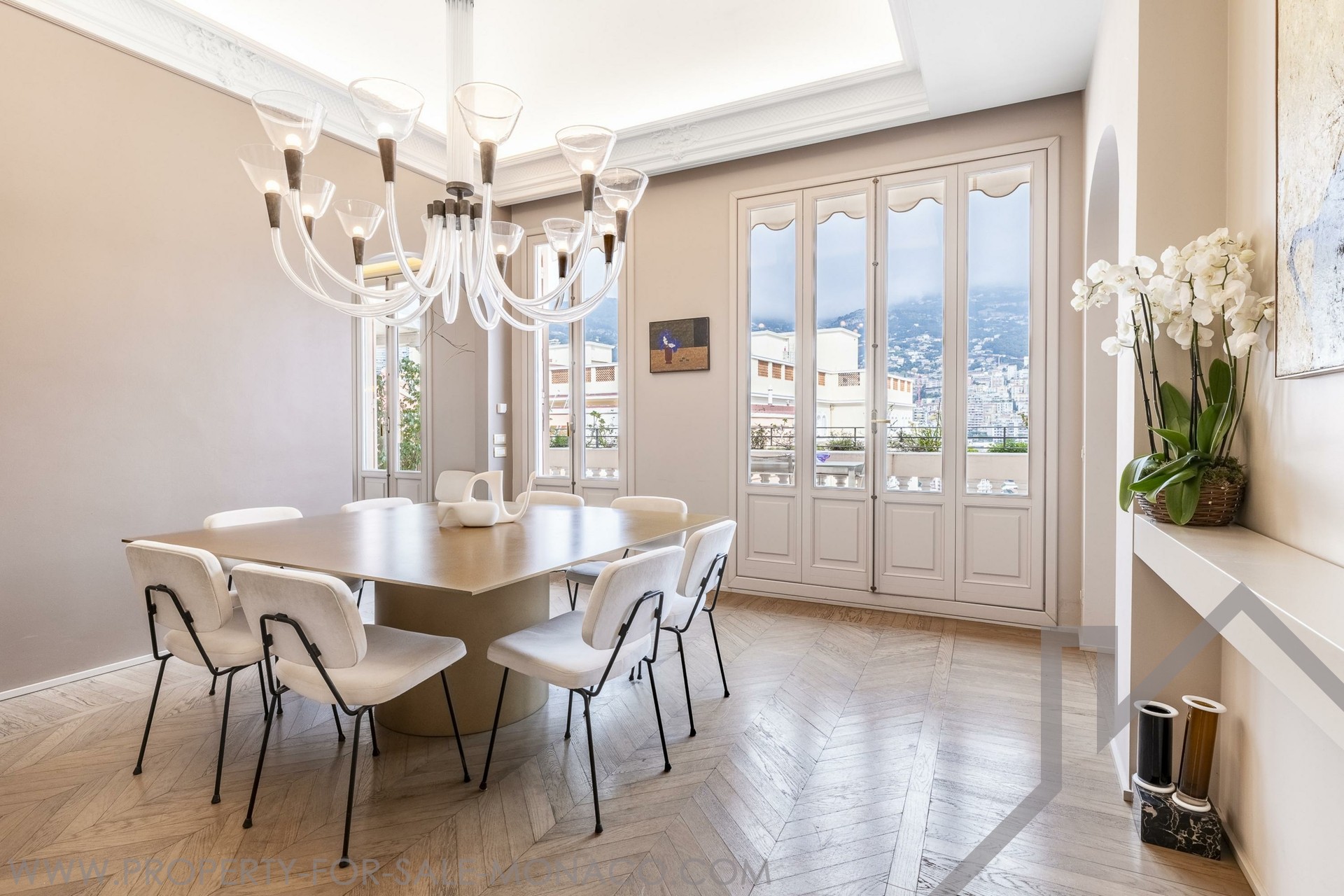 Ogni ambiente di questa residenza straordinaria è stato pensato per garantire intimità, comfort e carattere, in un contesto luminoso e sereno. È la perfetta fusione tra il fascino antico, tocchi contemporanei e una disposizione non convenzionale. Fin dall’ingresso, l’ampio soggiorno traverso, inondato di luce grazie alle grandi porte-finestre, si distingue per la notevole altezza del soffitto e si apre su una terrazza soleggiata dal fascino mediterraneo, ideale per momenti di relax con vista sui tetti di Monaco o sul mare.