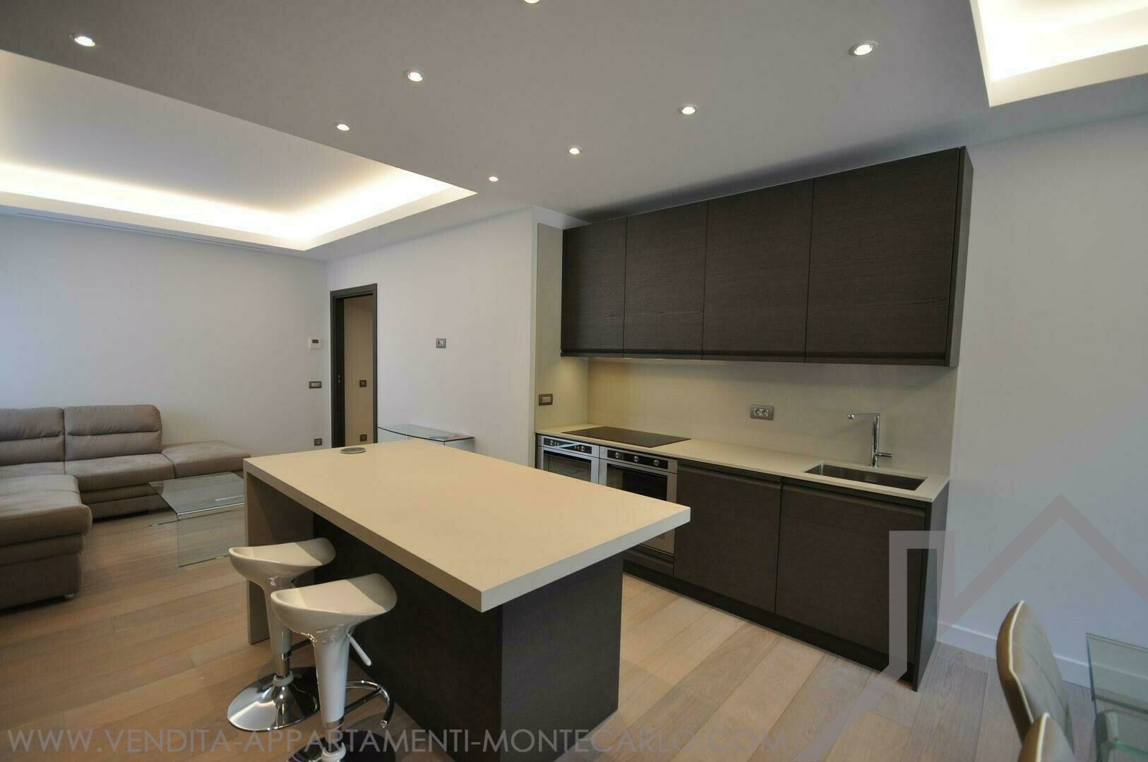 Una moderna cucina a pianta aperta completamente attrezzata con isola centrale,