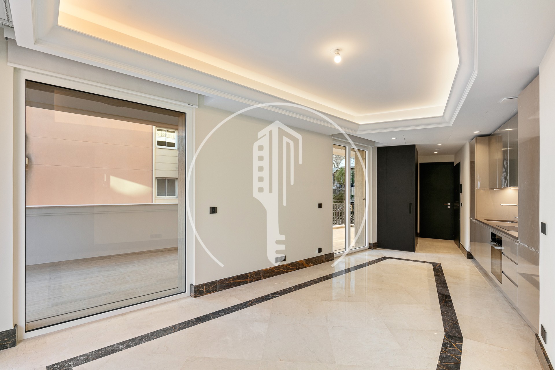 Le stanze principali si aprono su un'ampia terrazza angolare di 40 mq con vista sulla città, che permette di approfittare al massimo dell'aria aperta e del clima piacevole di cui gode il Principato di Monaco durante tutto l'anno.