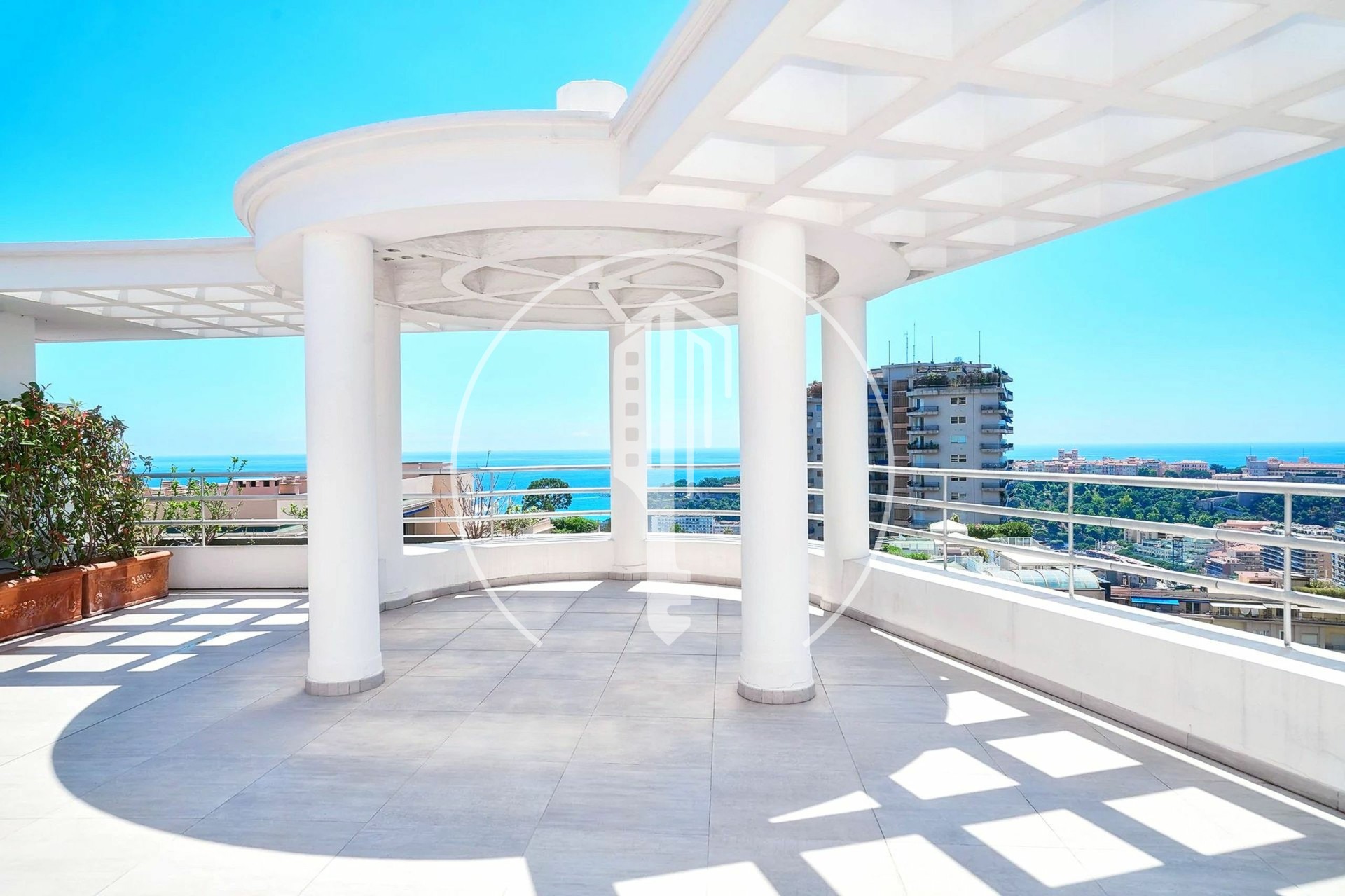 ESCLUSIVAAmpio attico/duplex con vista panoramica sul mare e un'ampia terrazza circolare sul tetto: Primo livello: ingresso, bagno di cortesia, doppio soggiorno/pranzo, cucina attrezzata, 2 camere con bagno privato, 1 camera di servizio con bagno, numerosi armadi a muro. 2 terrazze. Livello superiore: 1 ampia camera, 1 bagno con cabina armadio, uno studio. Box per 3 auto, 1 cantina.