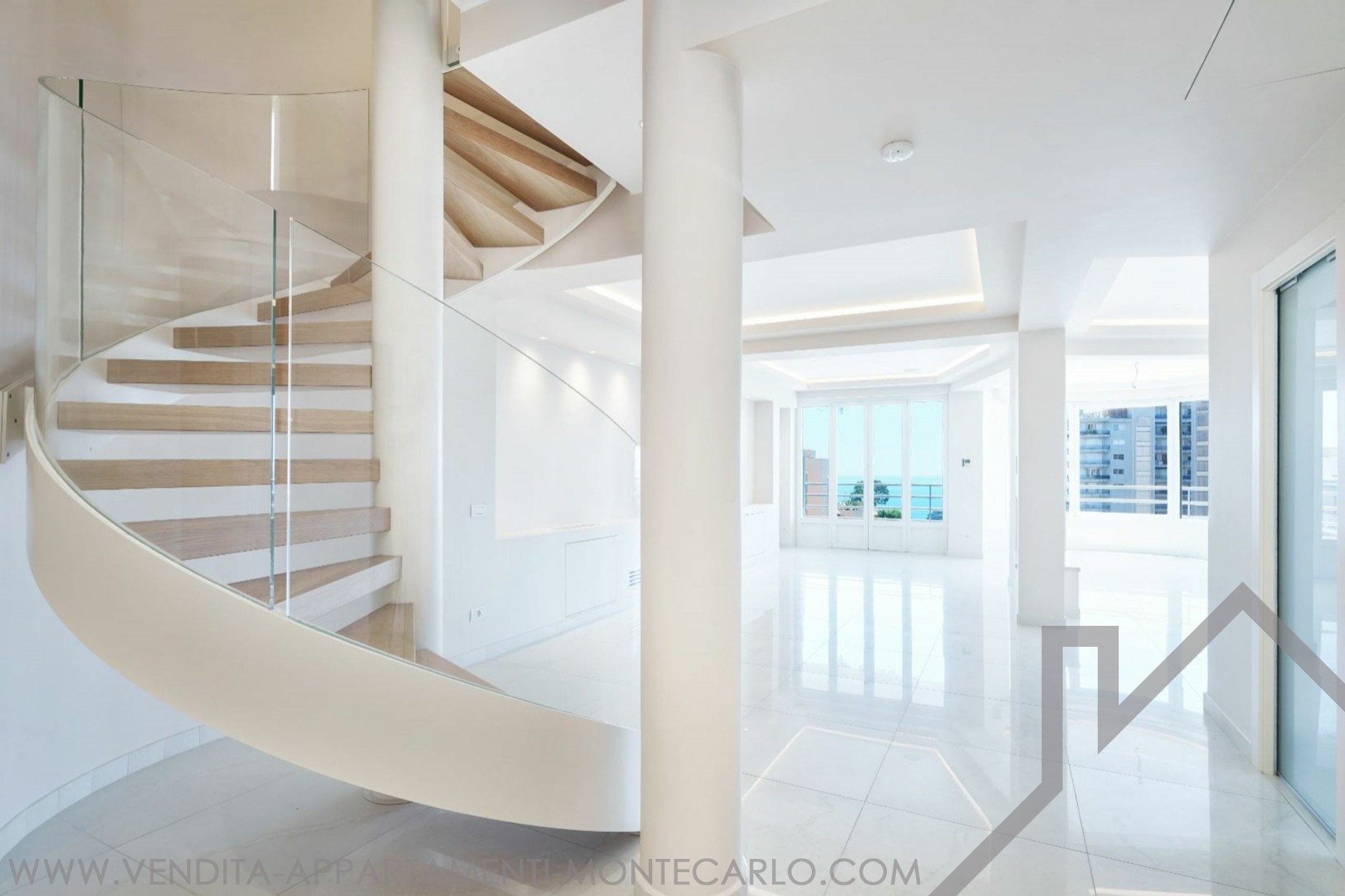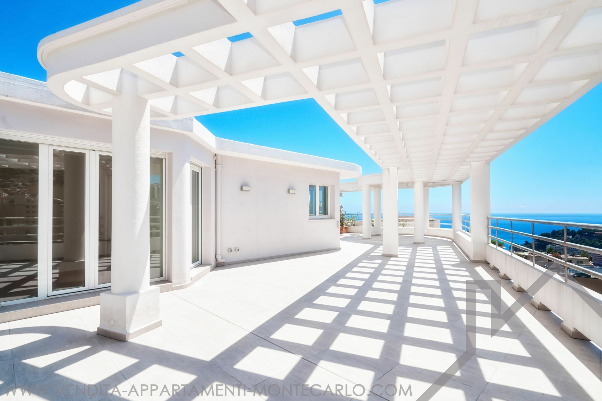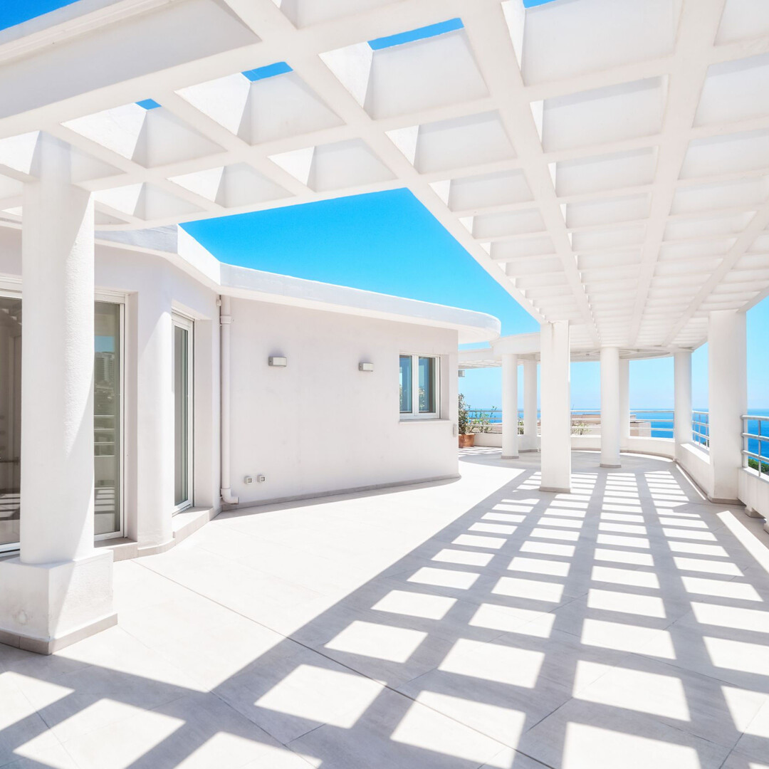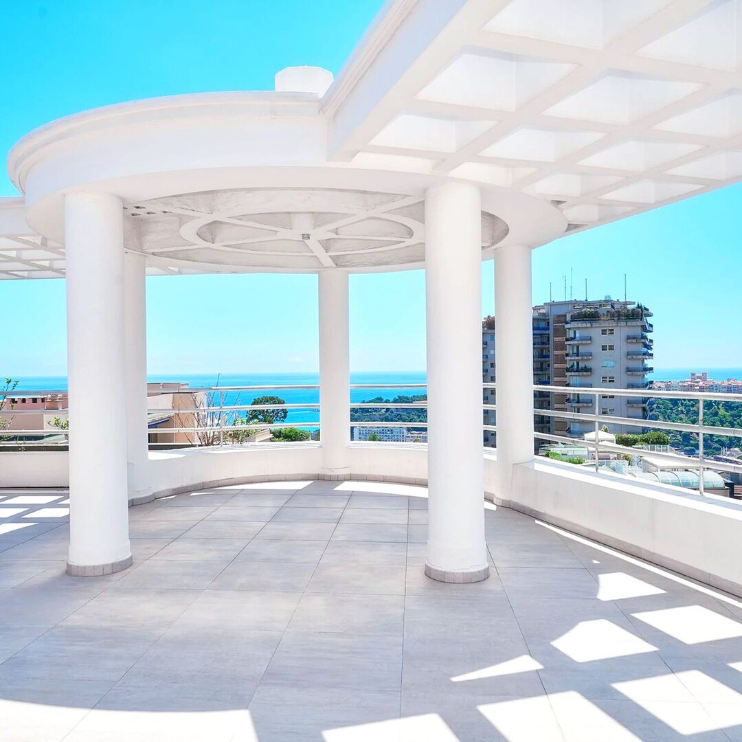 Ampio attico/duplex con vista panoramica sul mare e un'ampia terrazza circolare sul tetto: Primo livello: ingresso, bagno di cortesia, doppio soggiorno/pranzo, cucina attrezzata, 2 camere con bagno privato, 1 camera di servizio con bagno, numerosi armadi a muro. 2 terrazze. Livello superiore: 1 ampia camera, 1 bagno con cabina armadio, uno studio. Box per 3 auto, 1 cantina.