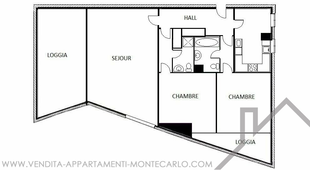 L'appartamento è composto da un ingresso, un ampio soggiorno con una profonda terrazza con vista sul mare, una cucina attrezzata con zona pranzo, due camere da letto e due bagni.