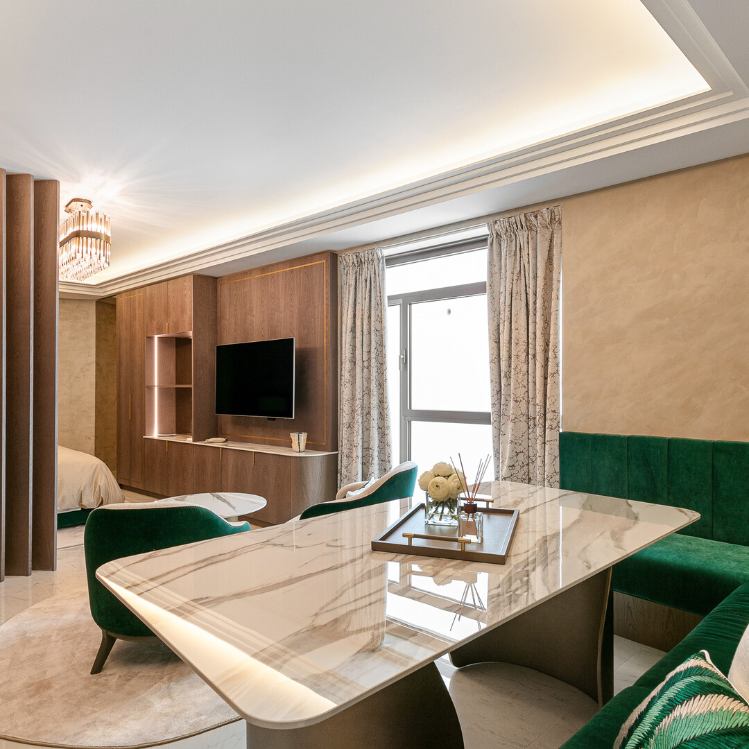 Un mobile TV a parete con armadi completa l'insieme, mentre le modanature rétroilluminate e un lampadario centrale sottolineano l'atmosfera dell'appartamento.
