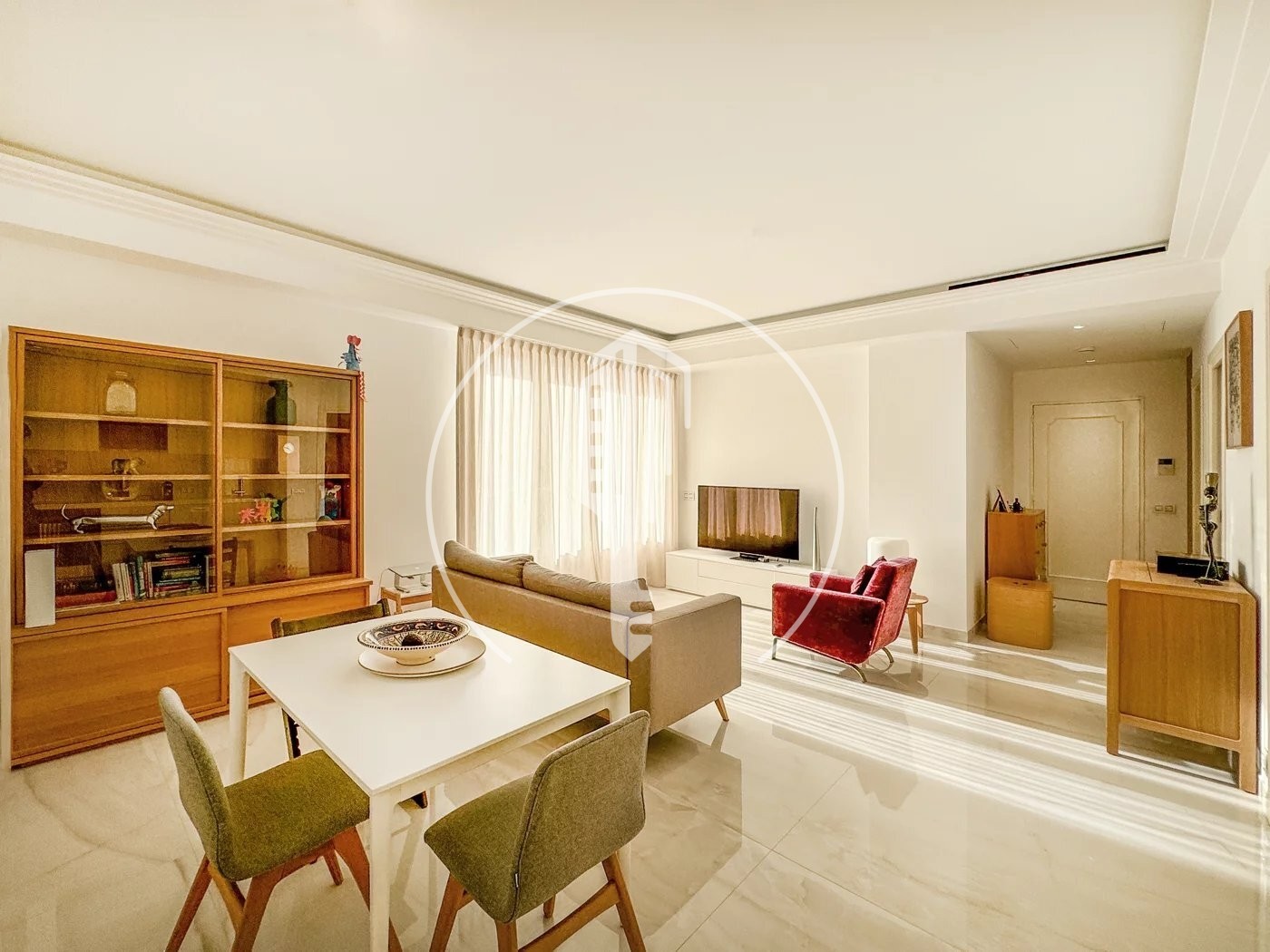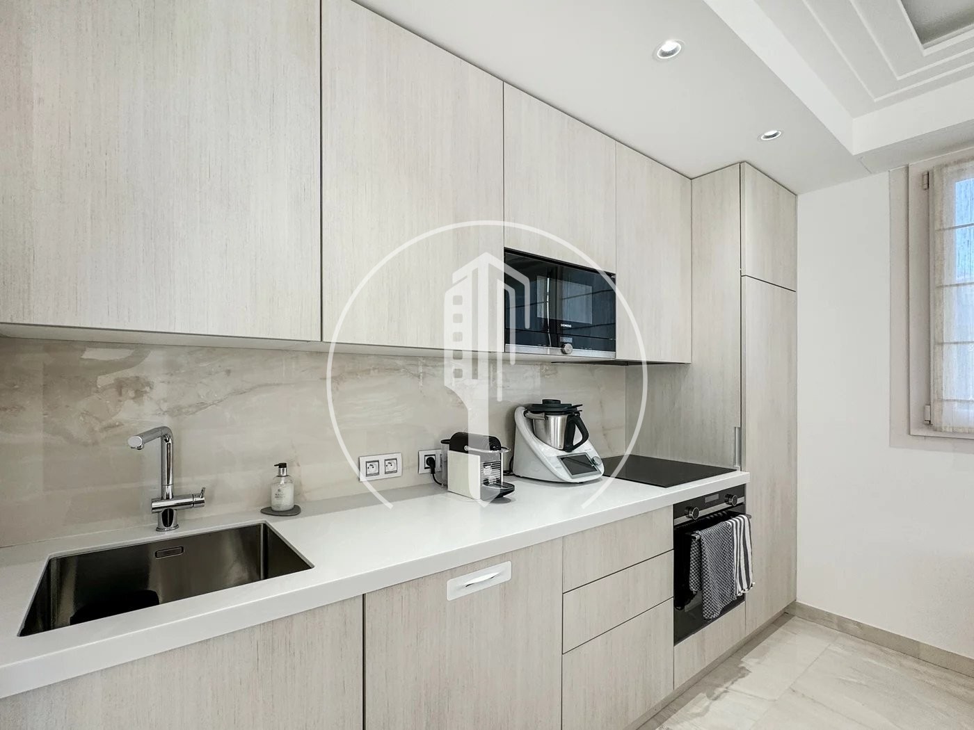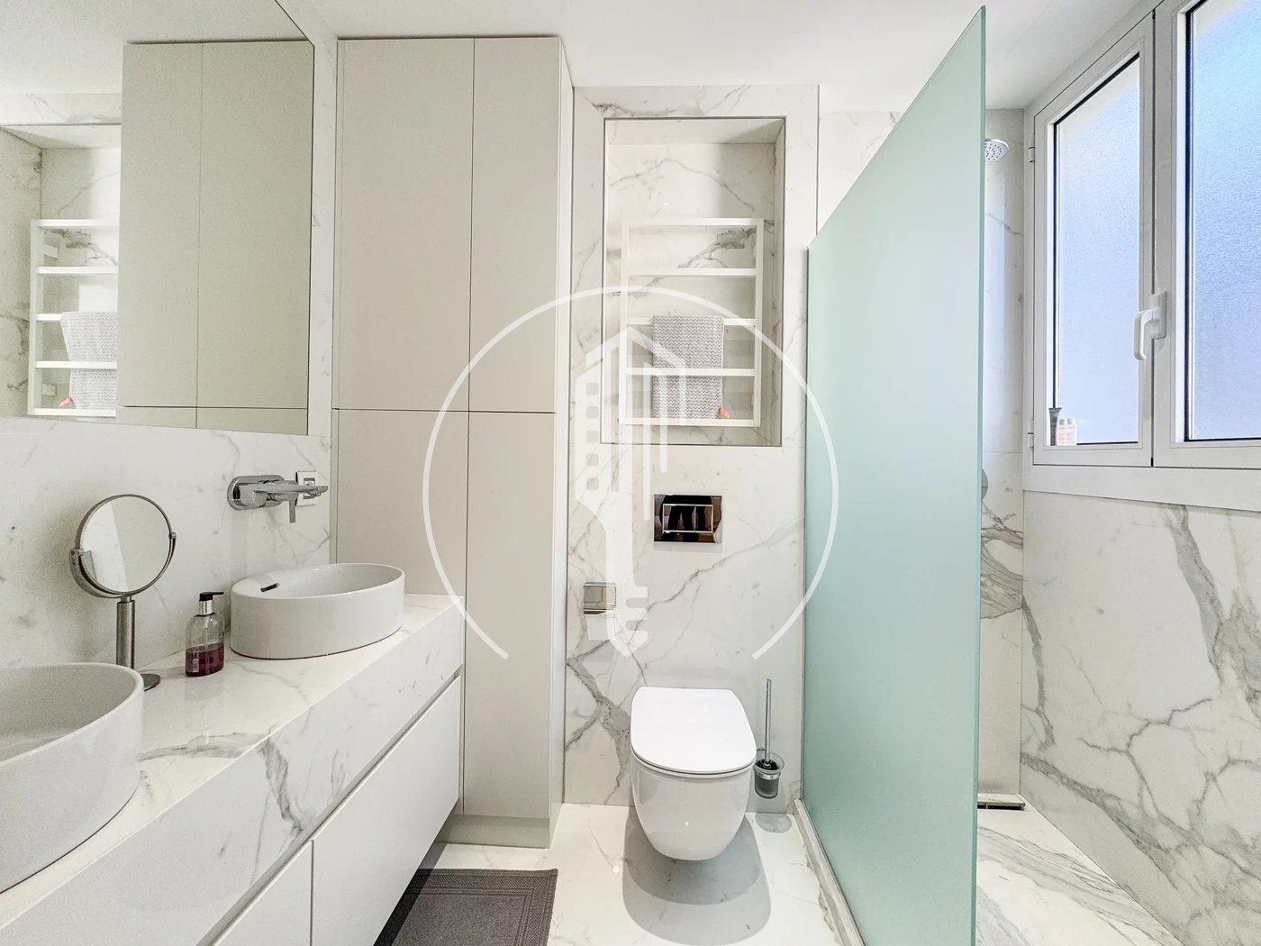 La cucina, completamente attrezzata e arredata, è pratica e contemporanea. Il bagno in marmo, con doppio lavabo, è l'emblema dell'eleganza e del comfort. L'intero appartamento è dotato di aria condizionata per un comfort ottimale in tutte le stagioni.