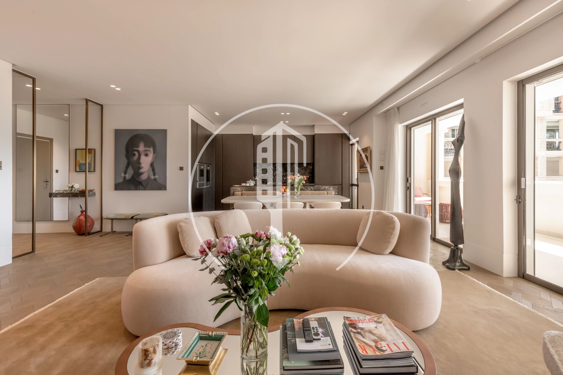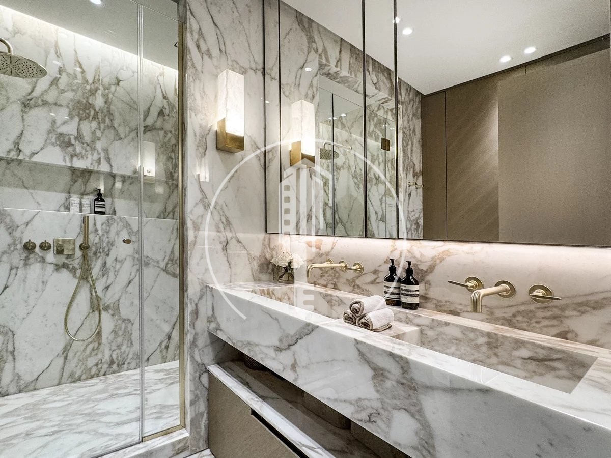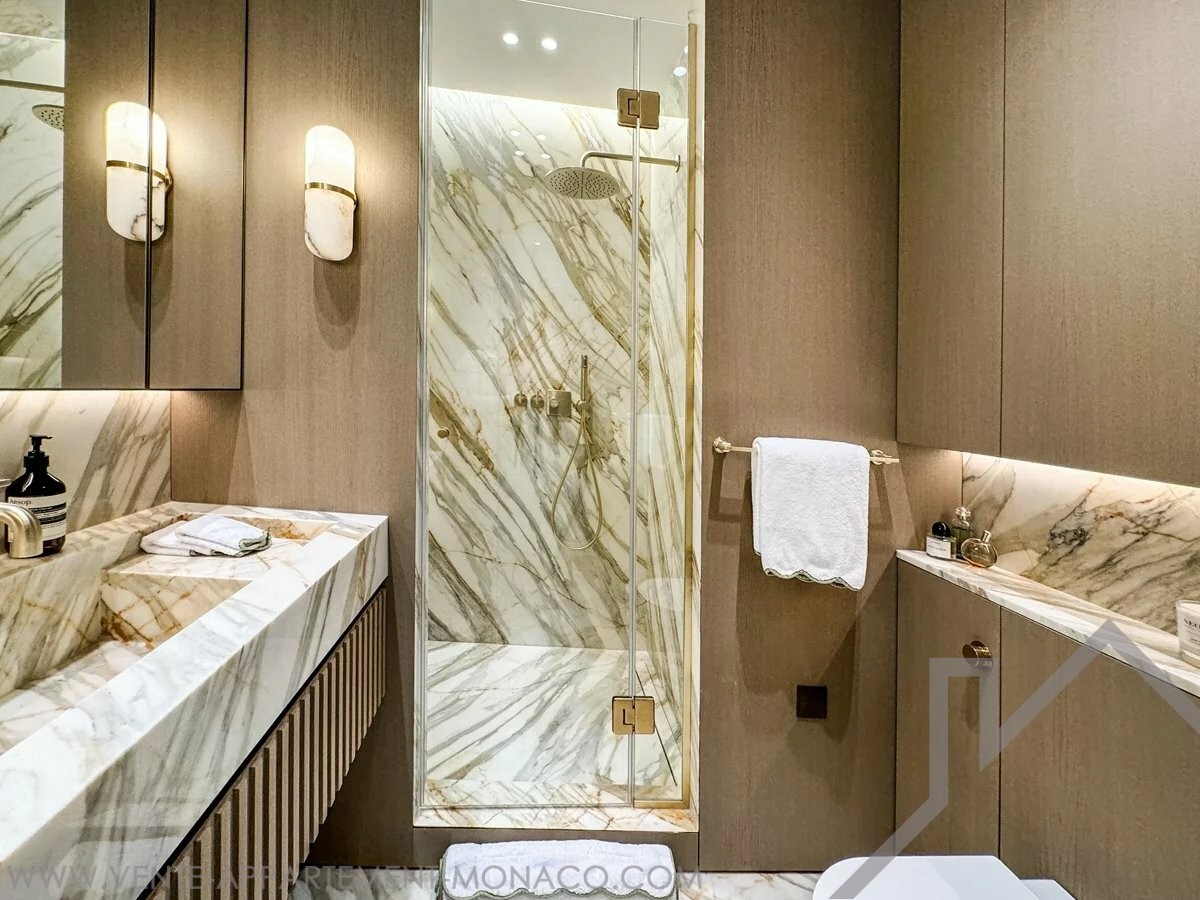 L’appartamento è composto da un ampio ingresso che conduce a un doppio soggiorno con cucina a vista completamente attrezzata, una camera padronale con bagno en suite, una cabina armadio e uno studio, due ulteriori camere en suite con bagni con doccia, un bagno per gli ospiti, nonché una profonda terrazza con una vista spettacolare sul porto di Cap-d’Ail.