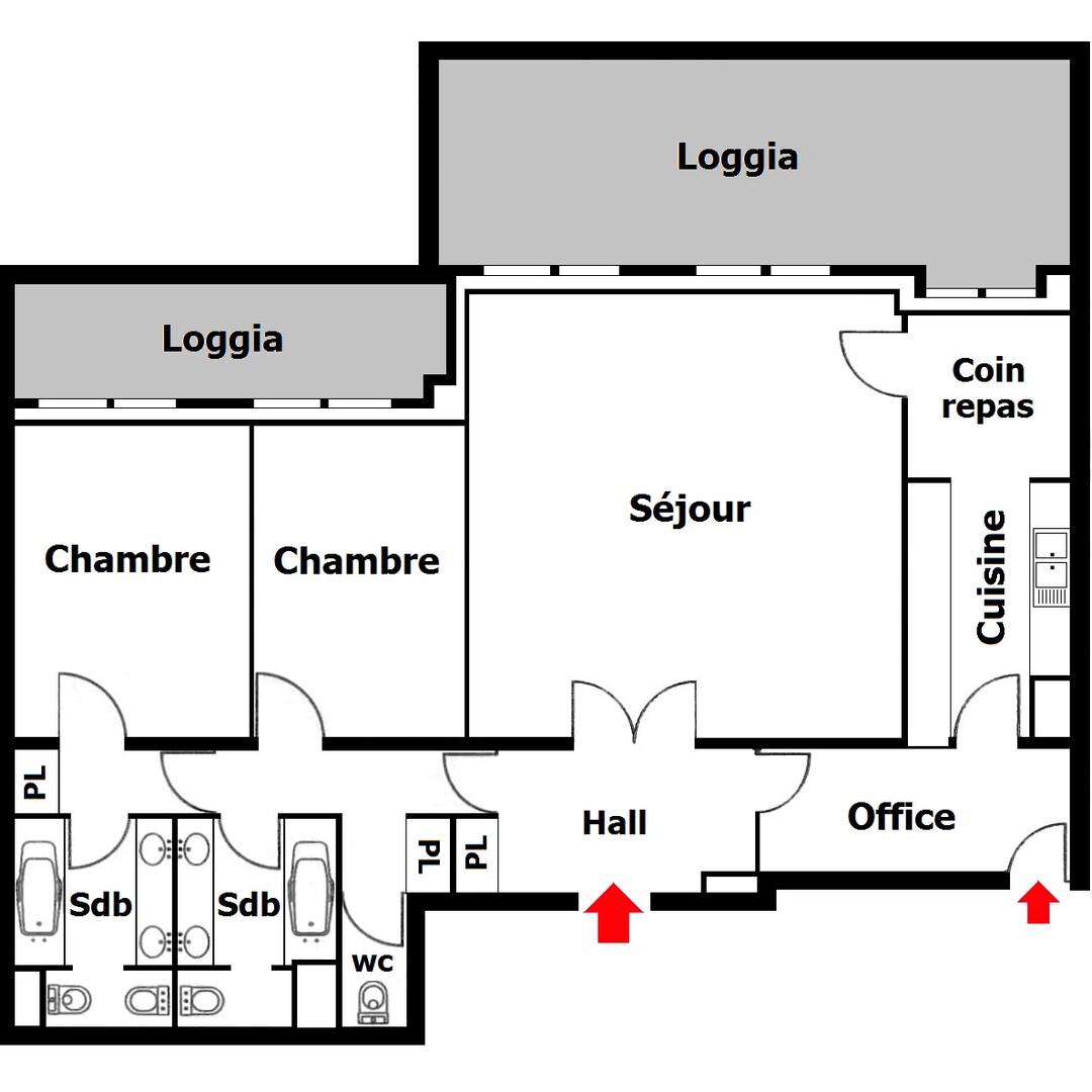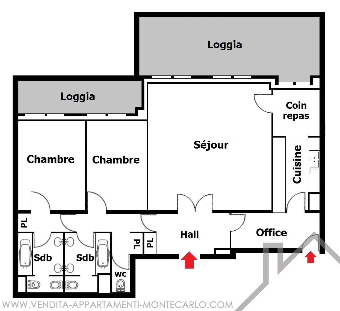 Ingresso, cucina attrezzata abitabile, tinello, soggiorno, due camere da letto, due bagni, servizi ospiti, armadi a muro, logge