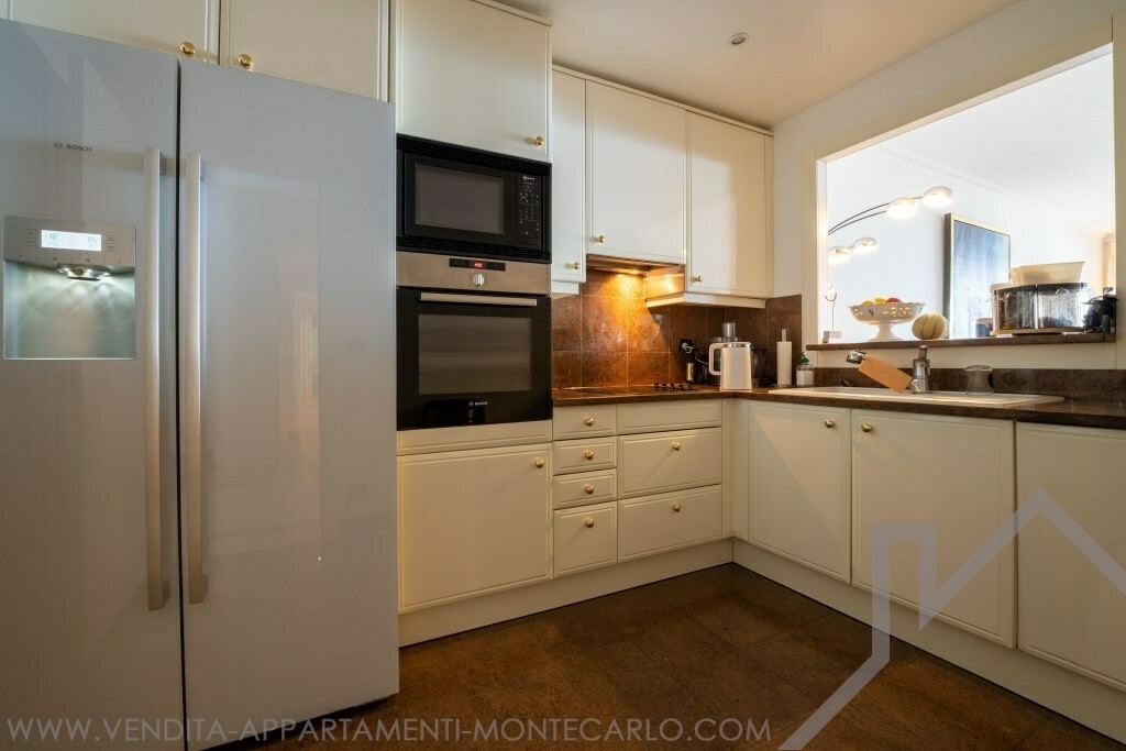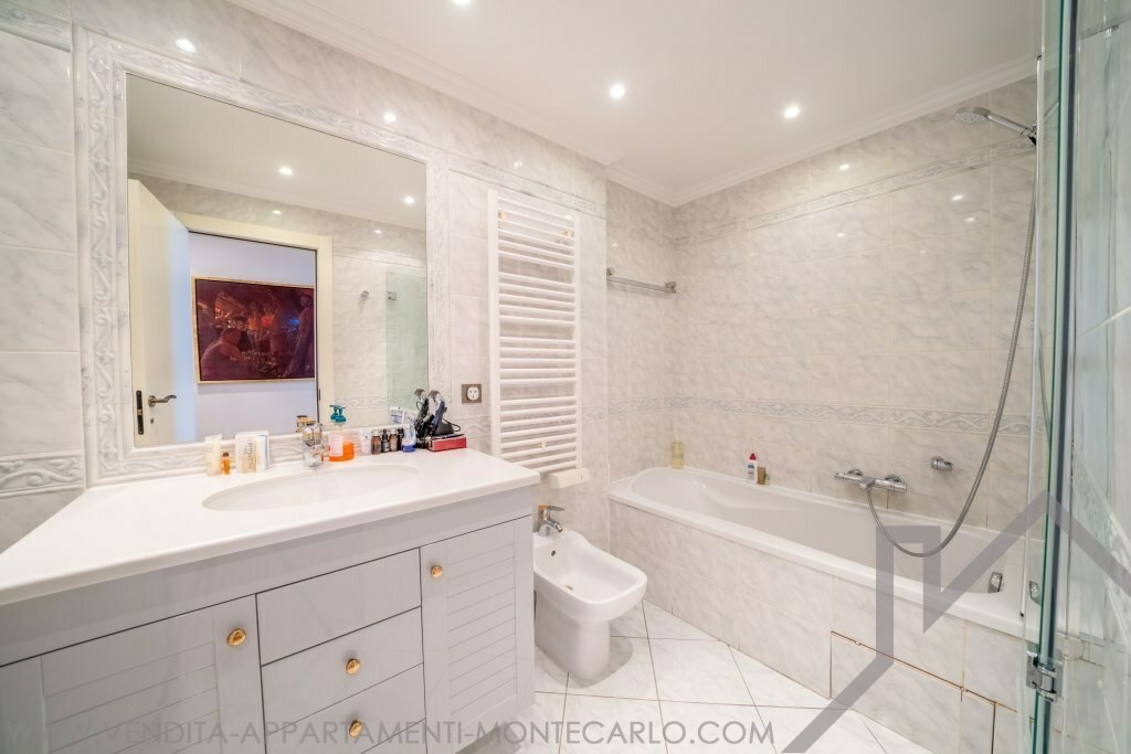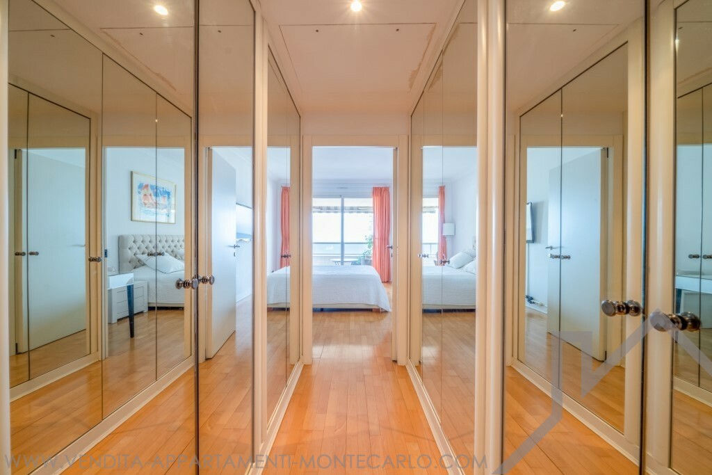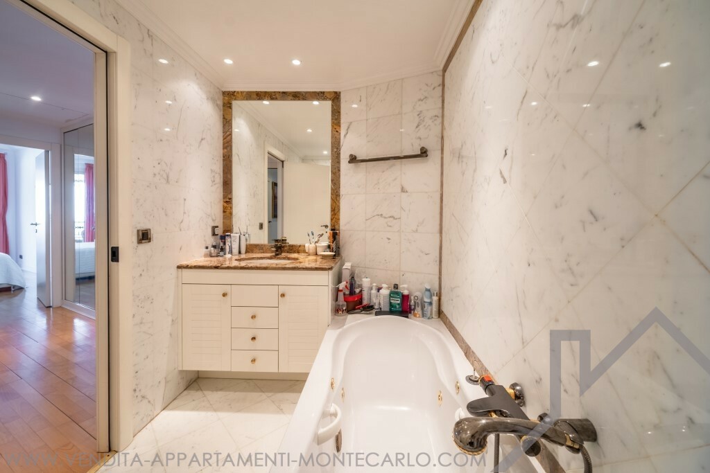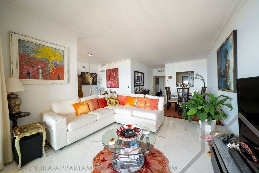 Ingresso, doppio soggiorno, due camere da letto con spogliatoi e bagni, servizio ospiti, cucina con angolo lavanderia, aria condizionata, doppi vetri, vasta terrazza. Cantina et due parcheggi.