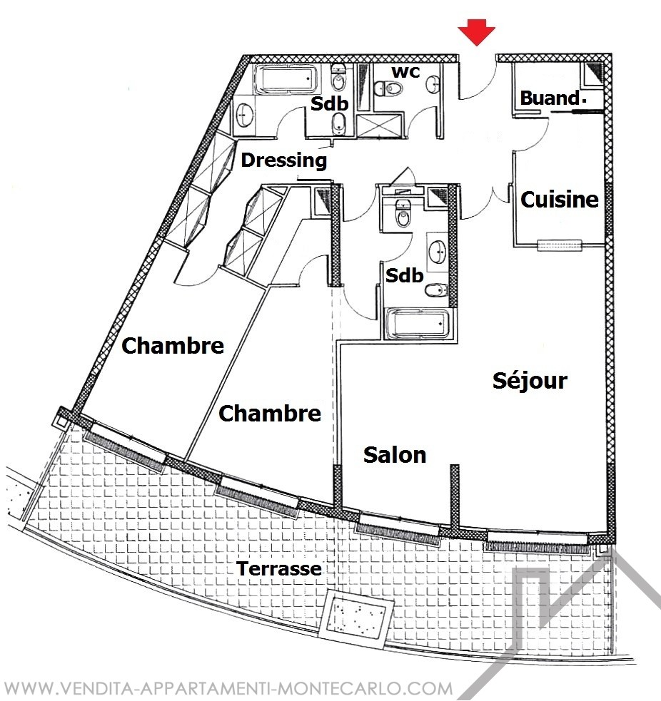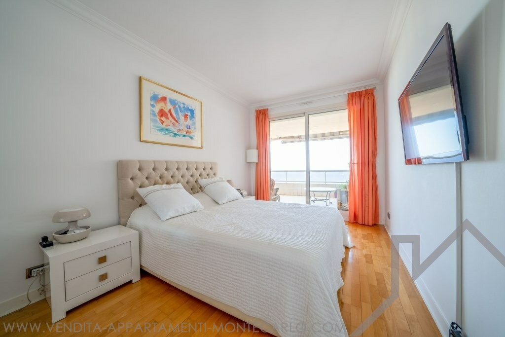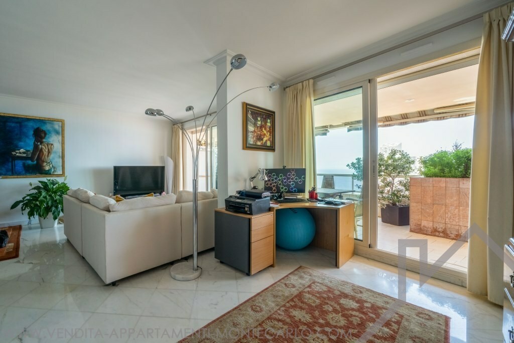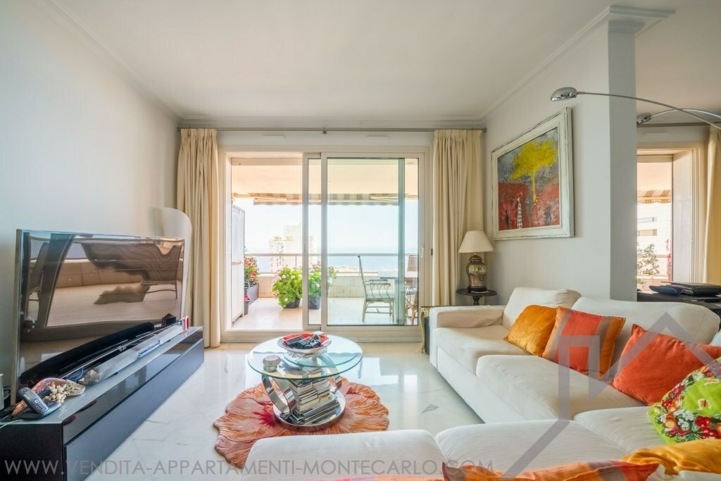 Ingresso, doppio soggiorno, due camere da letto con spogliatoi e bagni, servizio ospiti, cucina con angolo lavanderia, aria condizionata, doppi vetri, vasta terrazza. Cantina et due parcheggi.