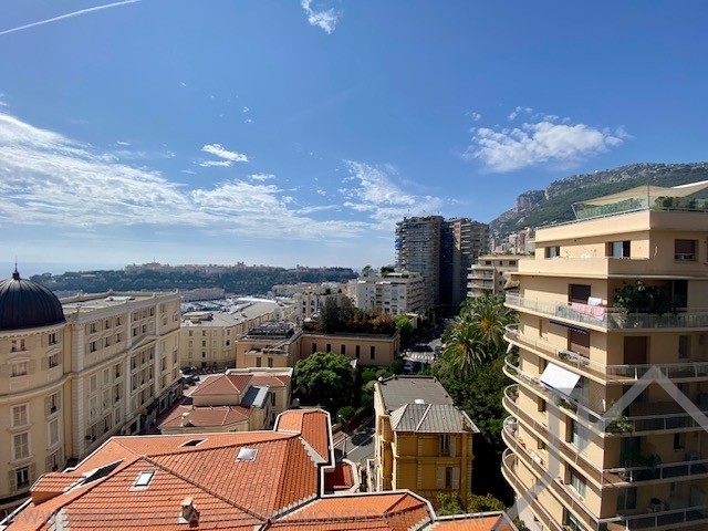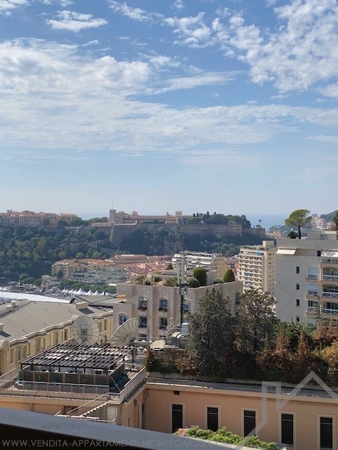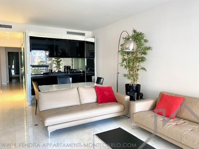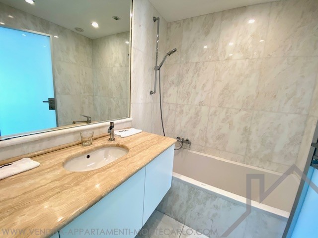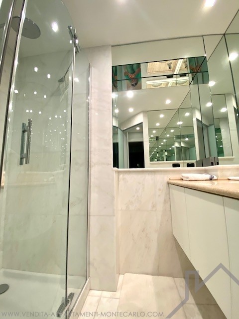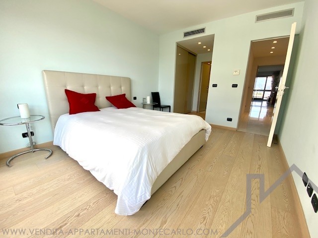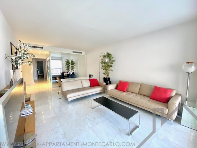 Si compone di un ingresso con armadi, un ampio soggiorno con cucina attrezzata che si apre su una grande terrazza sul lato giardino del Casinò, un corridoio, una toilette separata, una camera da letto con spogliatoio e bagno, una 2a camera da letto con loggia e bagno con doccia con vista a ovest con vista mare, Rocce e montagne