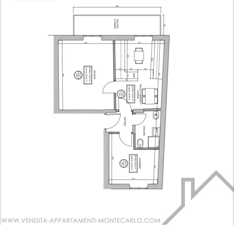 L'appartamento è composto da un ingresso, una cucina aperta sulla sala da pranzo, un soggiorno, una camera da letto, un bagno completo con doccia, una terrazza con vista mare
