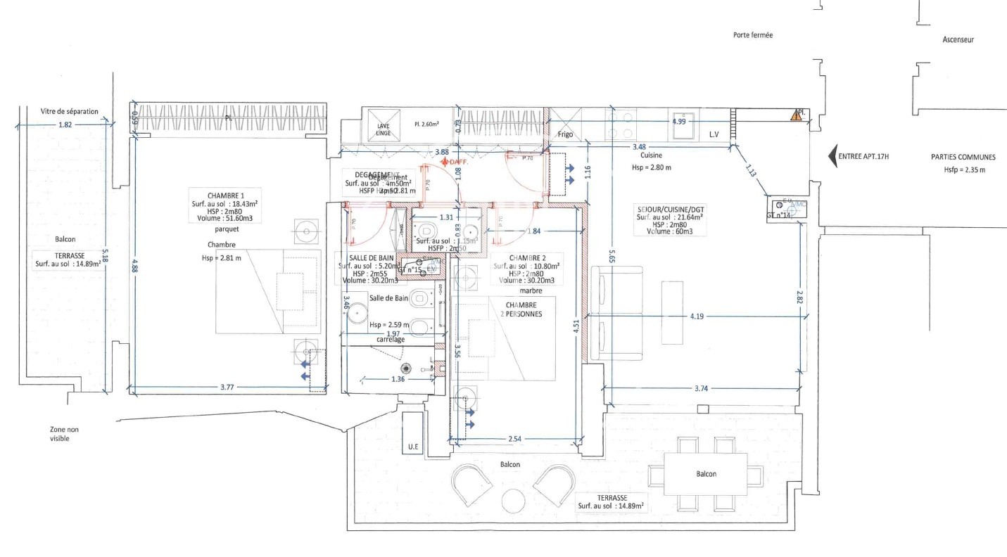È composto da: un soggiorno con cucina attrezzata, due camere da letto ciascuna con bagno con doccia, un bagno per gli ospiti e molto spazio di archiviazione.