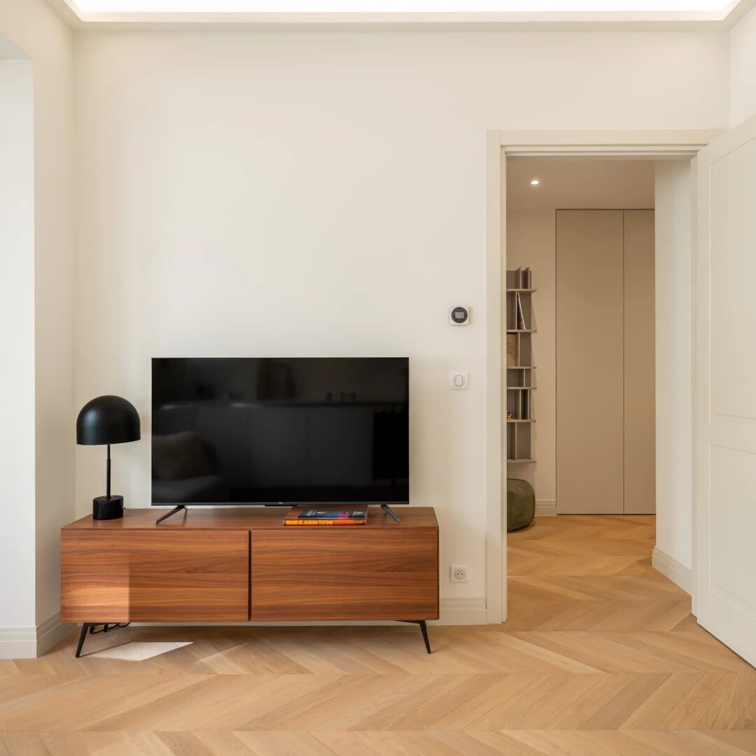 È composto da un ingresso, un soggiorno con cucina a vista, una camera da letto con ripostiglio, un bagno con doccia e una zona lavanderia. Tutte le zone giorno si aprono su un balcone.