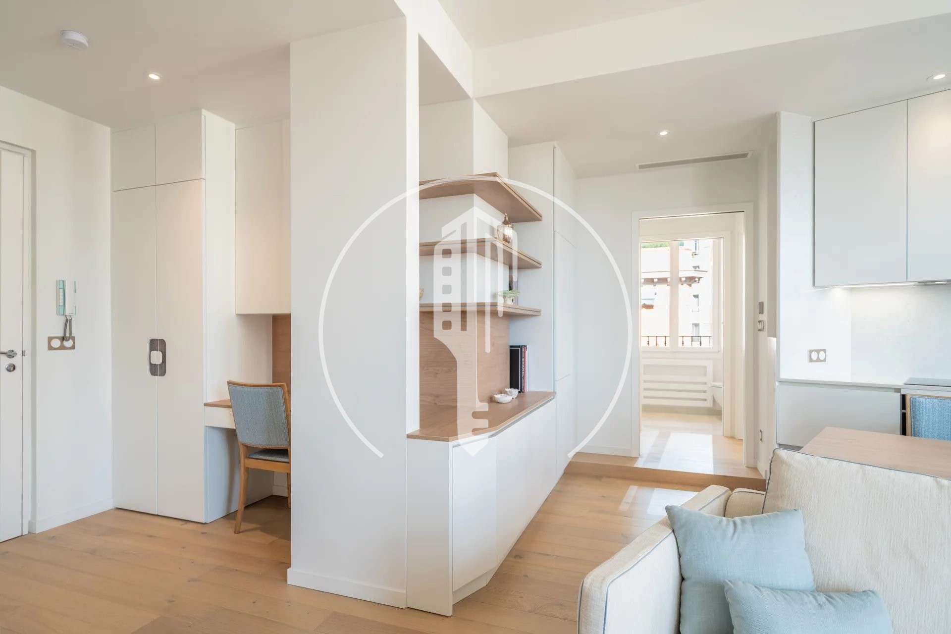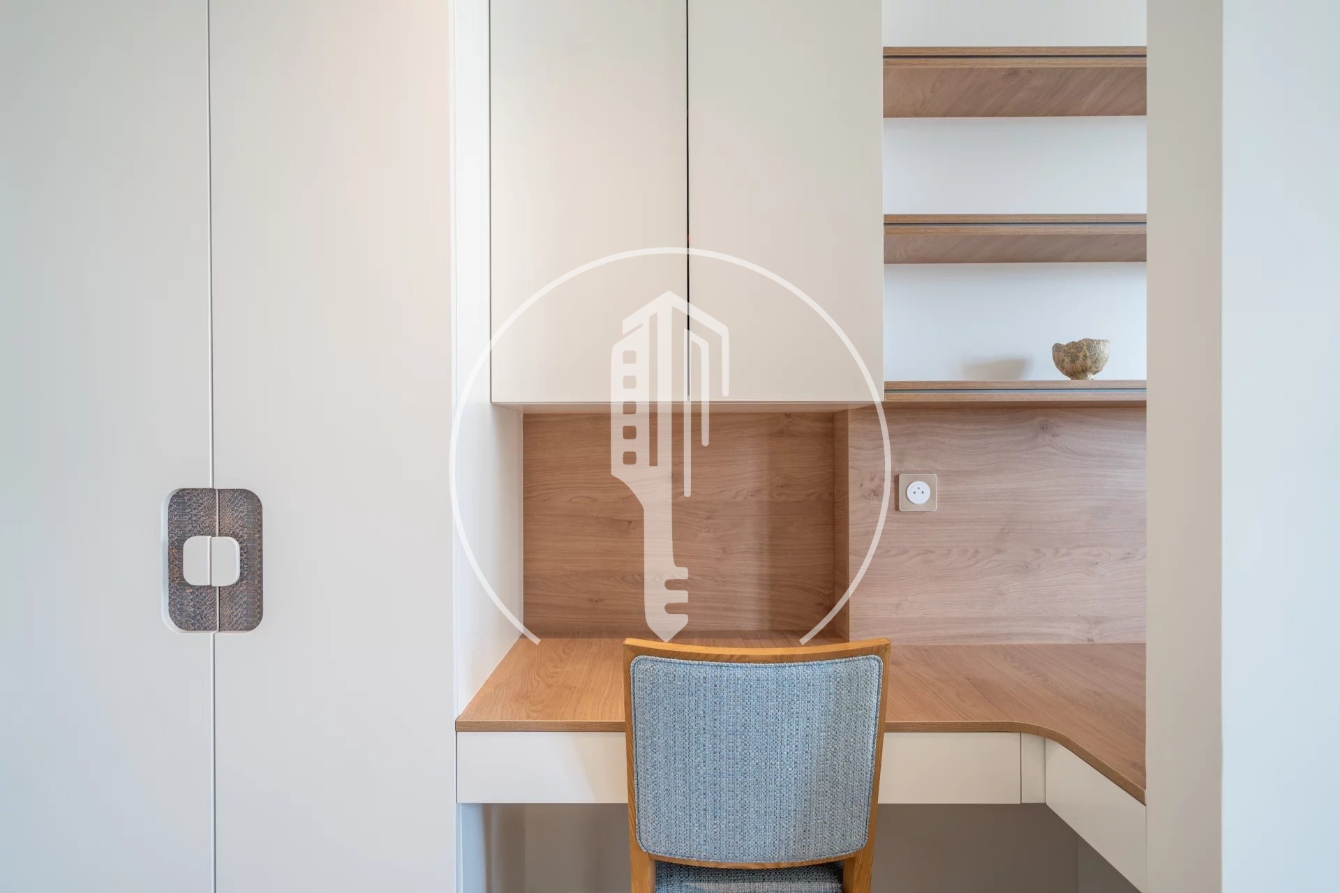 È composto da un ingresso con zona studio, un soggiorno che si apre su un balcone, una cucina attrezzata che si apre sul soggiorno, una camera da letto con numerosi armadi e un bagno con doccia.