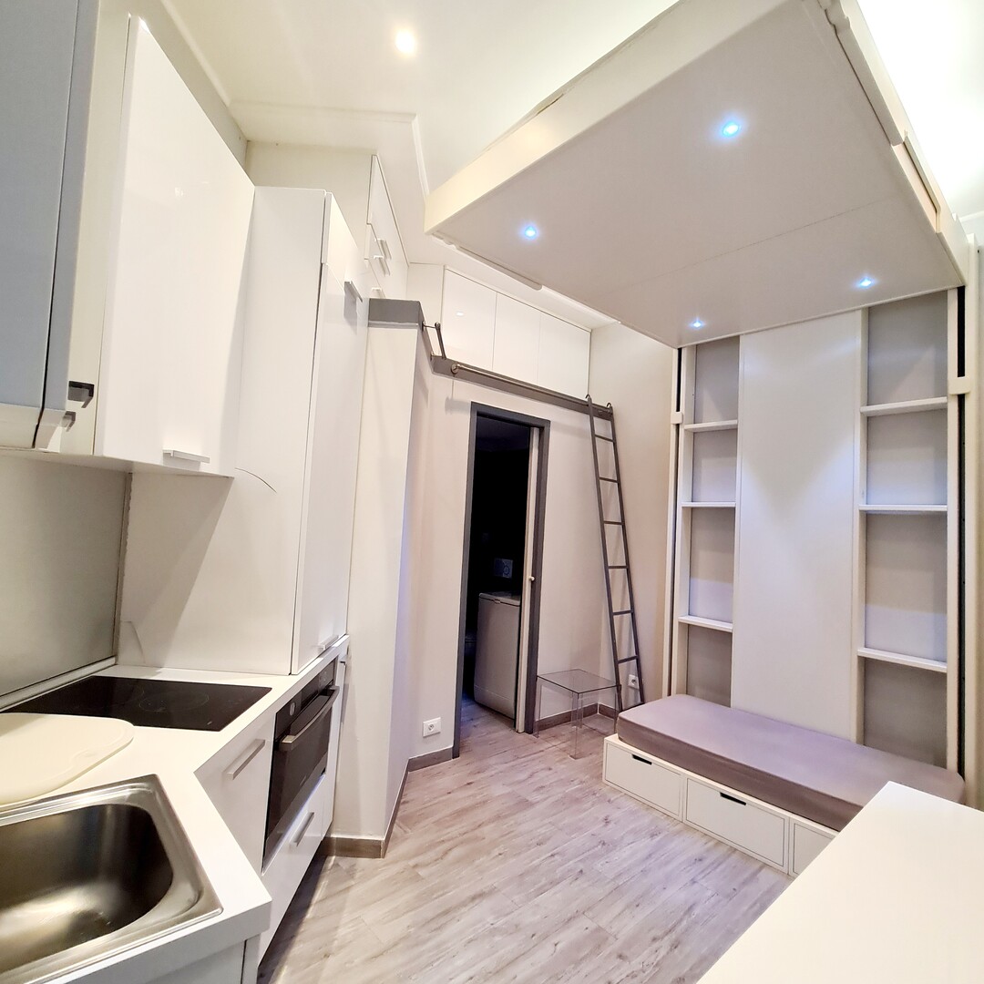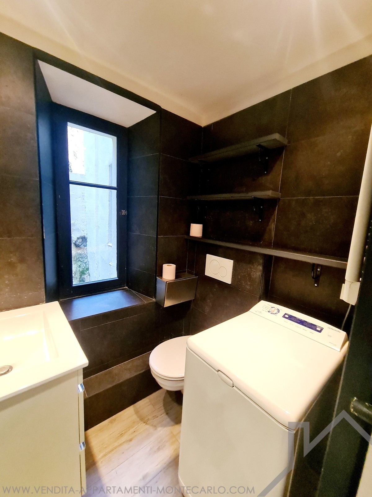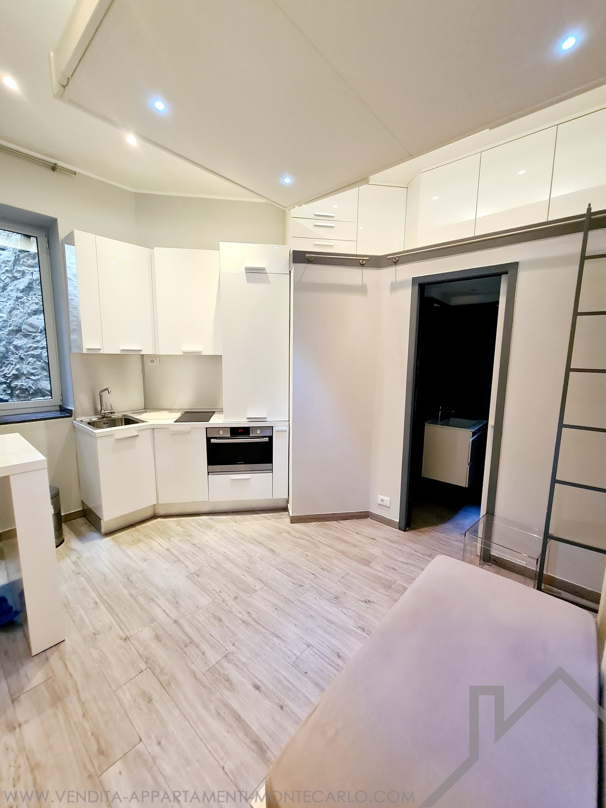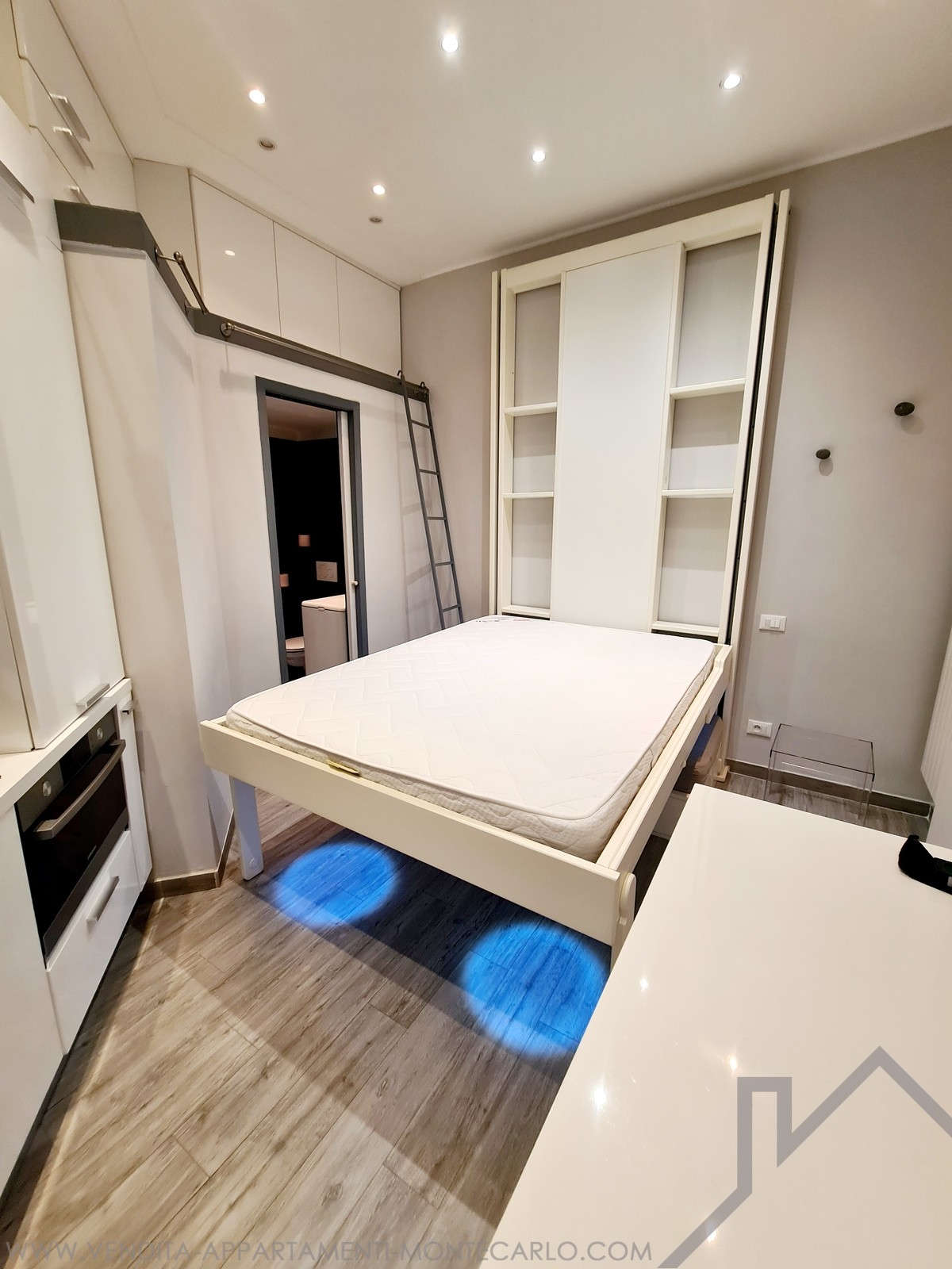 Monolocale sul retro dell'edificio (al 2° sottopiano) composto da una locale principale con angolo cottura, un bagno con wc. Arredato con mobili su misura, è il pied-à-terre perfetto per una persona