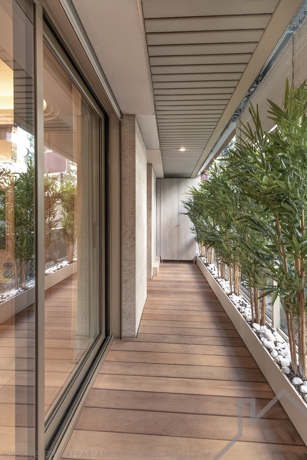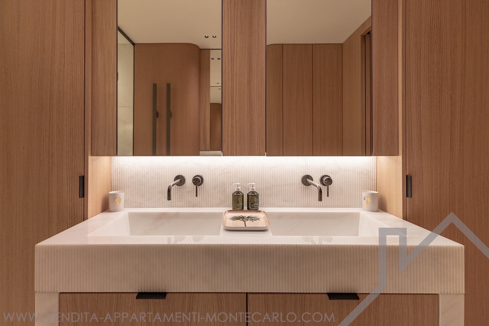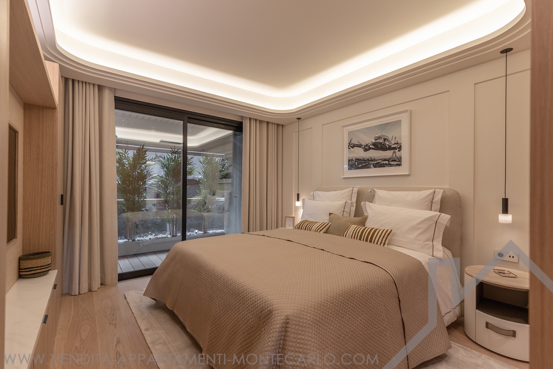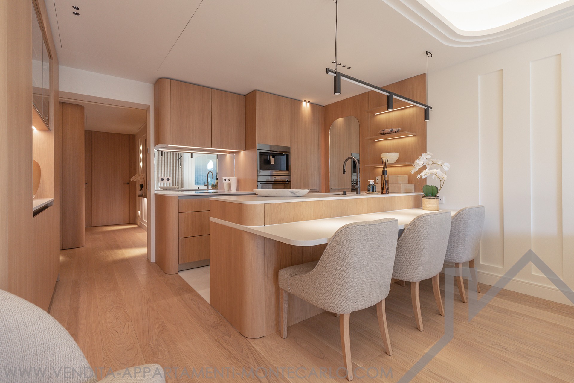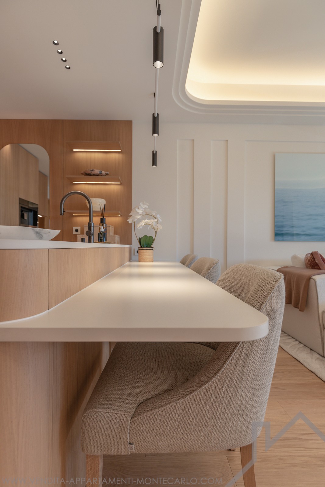 The spacious living room opens onto a landscaped terrace, offering uninterrupted views over Casino Square. The kitchen design and bespoke joinery integrate seamlessly throughout the apartment, creating a refined and cohesive living space. Kreon lighting enhances the atmosphere and highlights every detail.