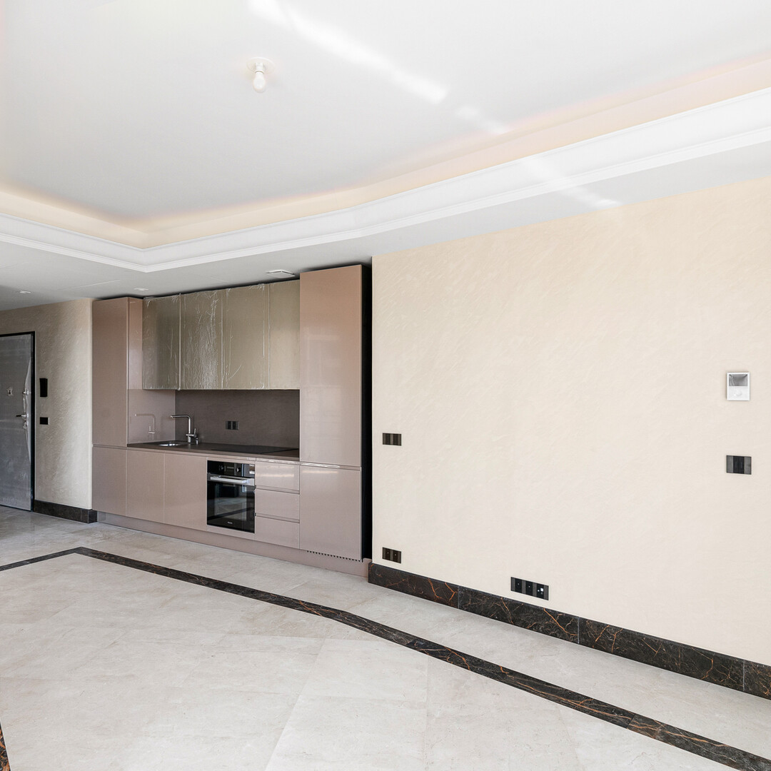 Rifinito in modo eccellente, l'appartamento comprende un ingresso con armadio a muro e illuminazione interna, una toilette per gli ospiti con specchio e lavabo su misura, un soggiorno luminoso e arioso con due diversi pavimenti in marmo, pareti in stucco e soffitto con cornici illuminate.