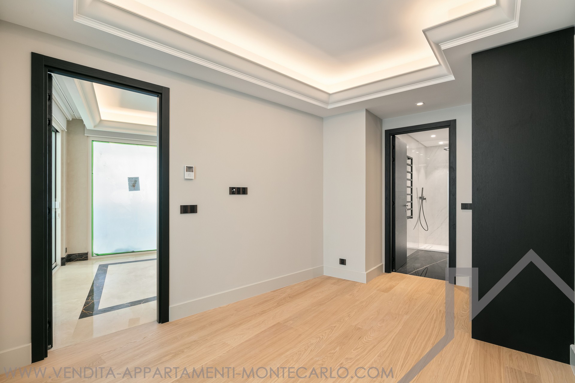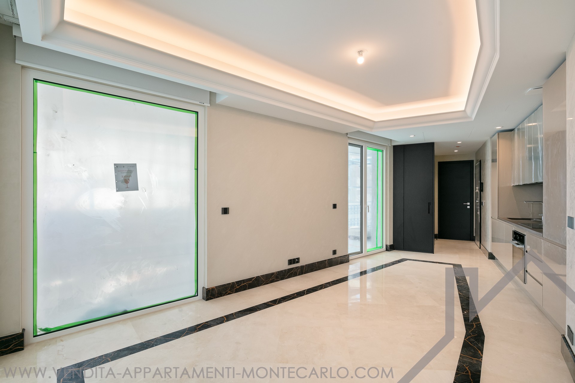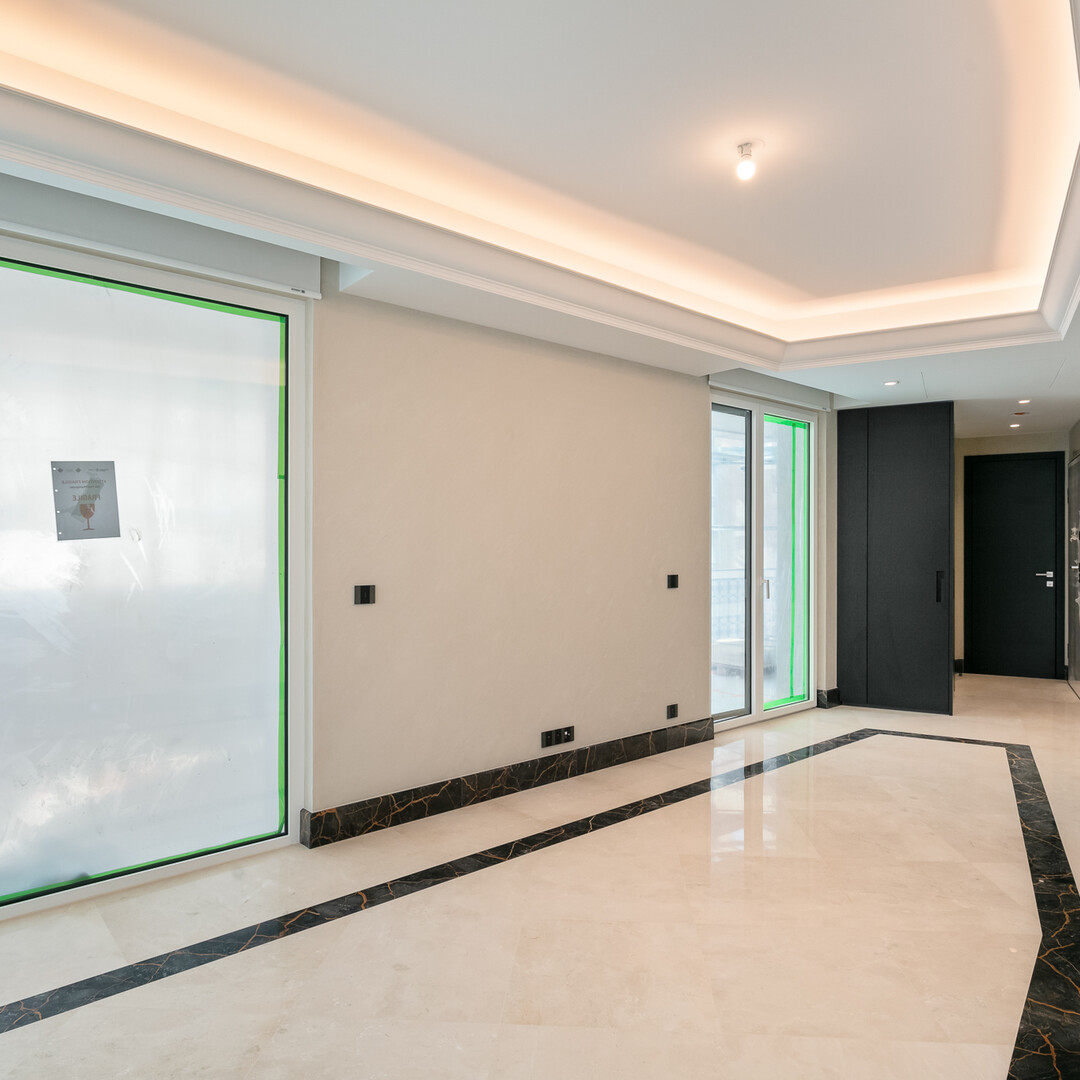 Il luminoso soggiorno ha due diversi pavimenti in marmo, pareti in stucco e un soffitto a cornice retroilluminato.