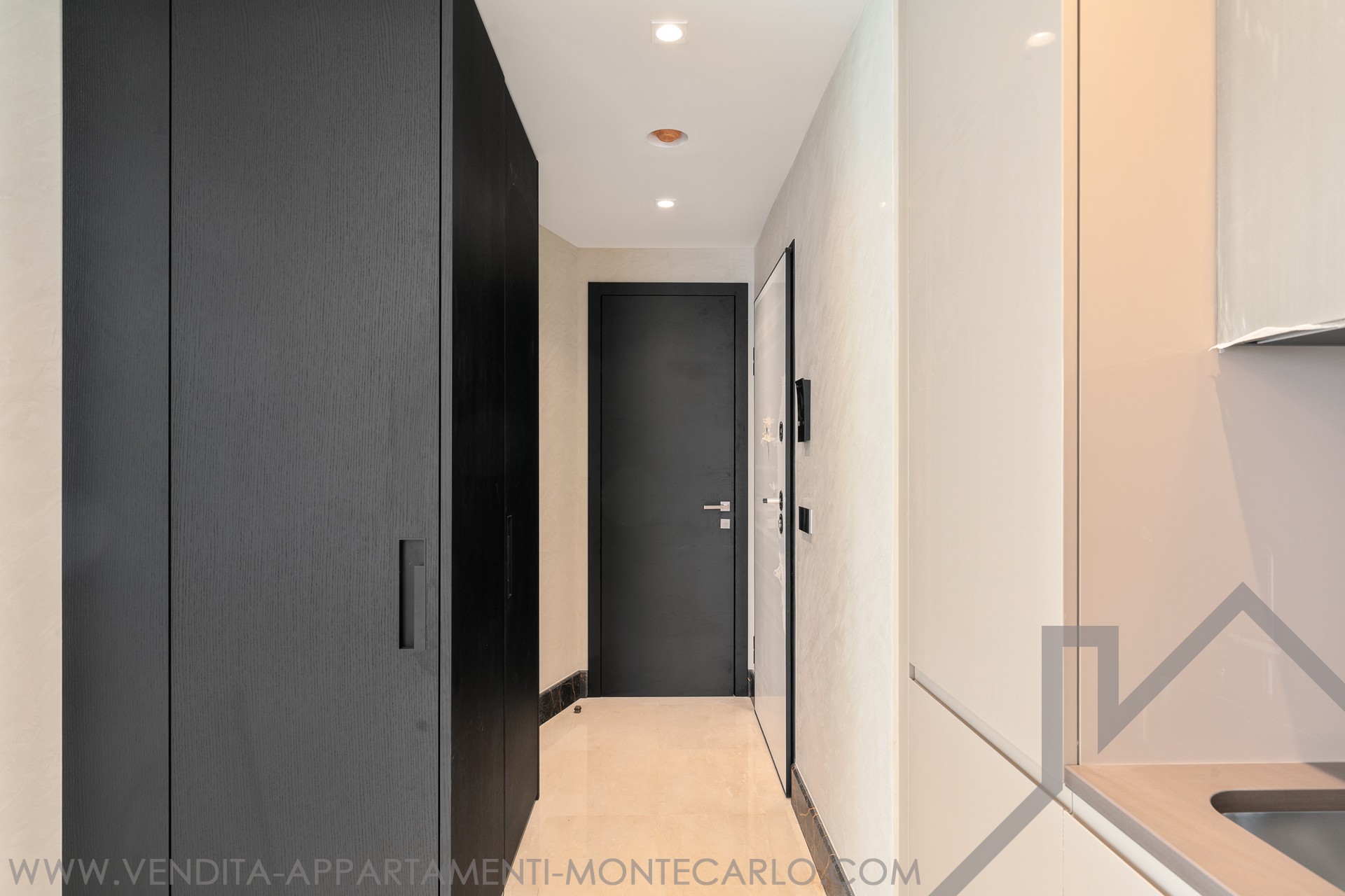 È composto da un ingresso con armadio a muro e illuminazione interna e da un bagno per gli ospiti con specchio e lavabo su misura.