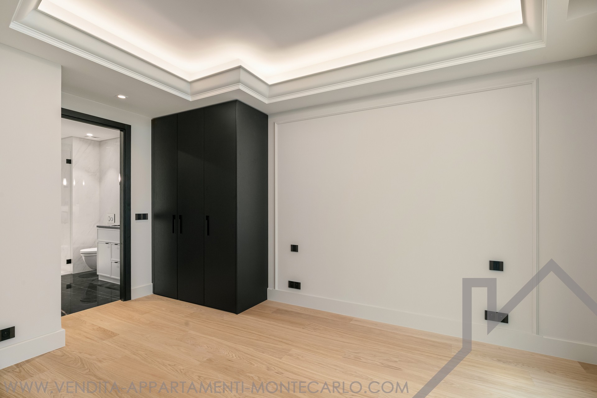 La camera da letto ha un armadio a muro con illuminazione interna, pavimenti in parquet, una testiera sagomata e un bagno con doccia a doppio lavabo.
