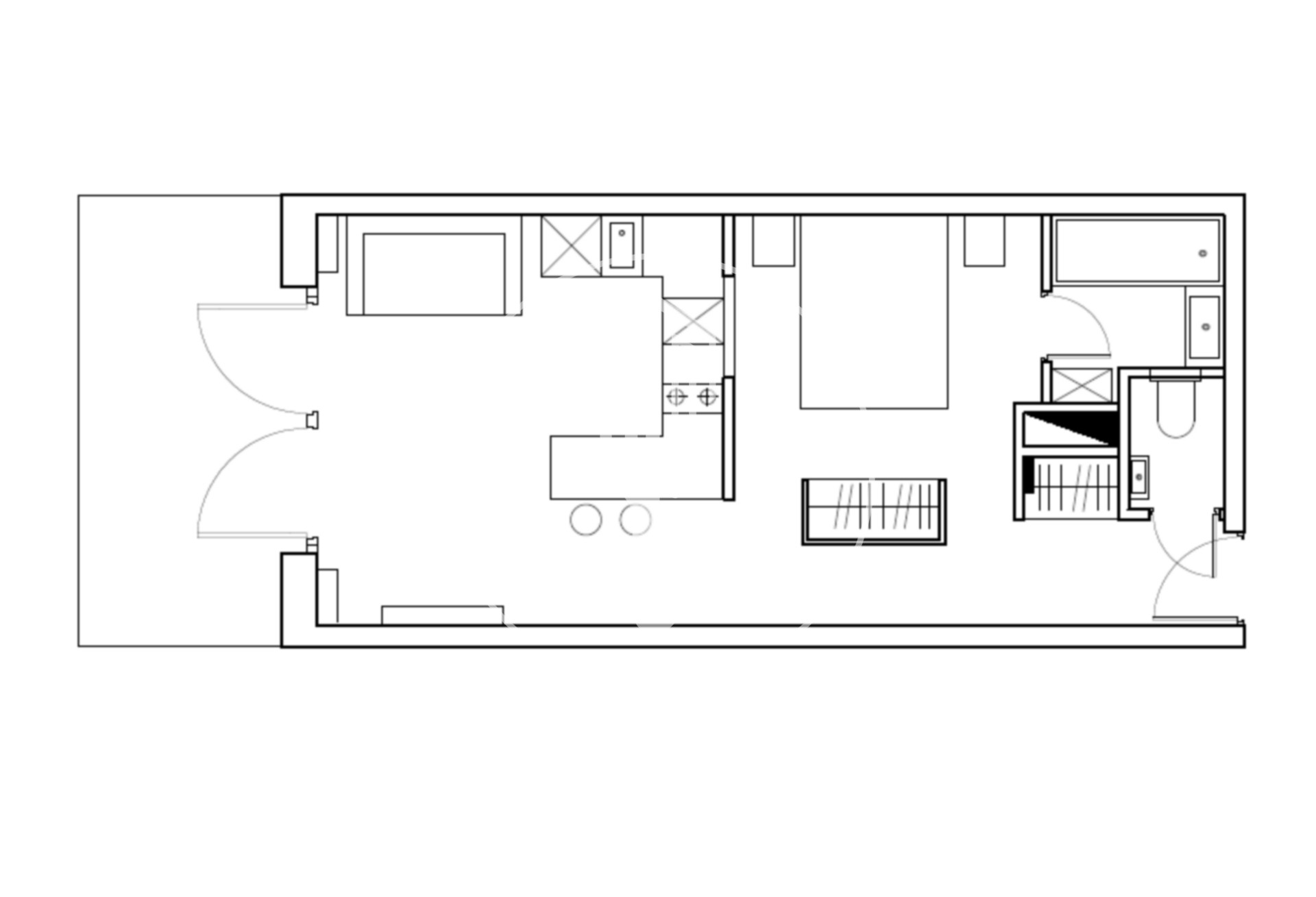 È composto da un ingresso, una cucina a vista attrezzata, un soggiorno che si apre su una loggia, una zona notte separata, un bagno e una toilette separata. L'appartamento gode di una vista sul mare e sul giardino.
