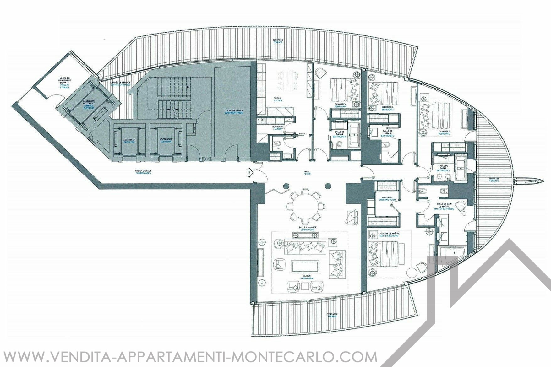 Stupendo appartamento di 5 locali, in residence di lusso, con vista panoramica sul mare, della superficie totale di circa 349 mq, di cui 246 mq abitativi e 103 mq di terrazzi. Descrizione: Ingresso, ingresso di servizio, soggiorno, cucina, ufficio, quattro camere da letto e bagni, spogliatoio, wc ospiti, terrazzi, 2 posti auto e 1 cantina.