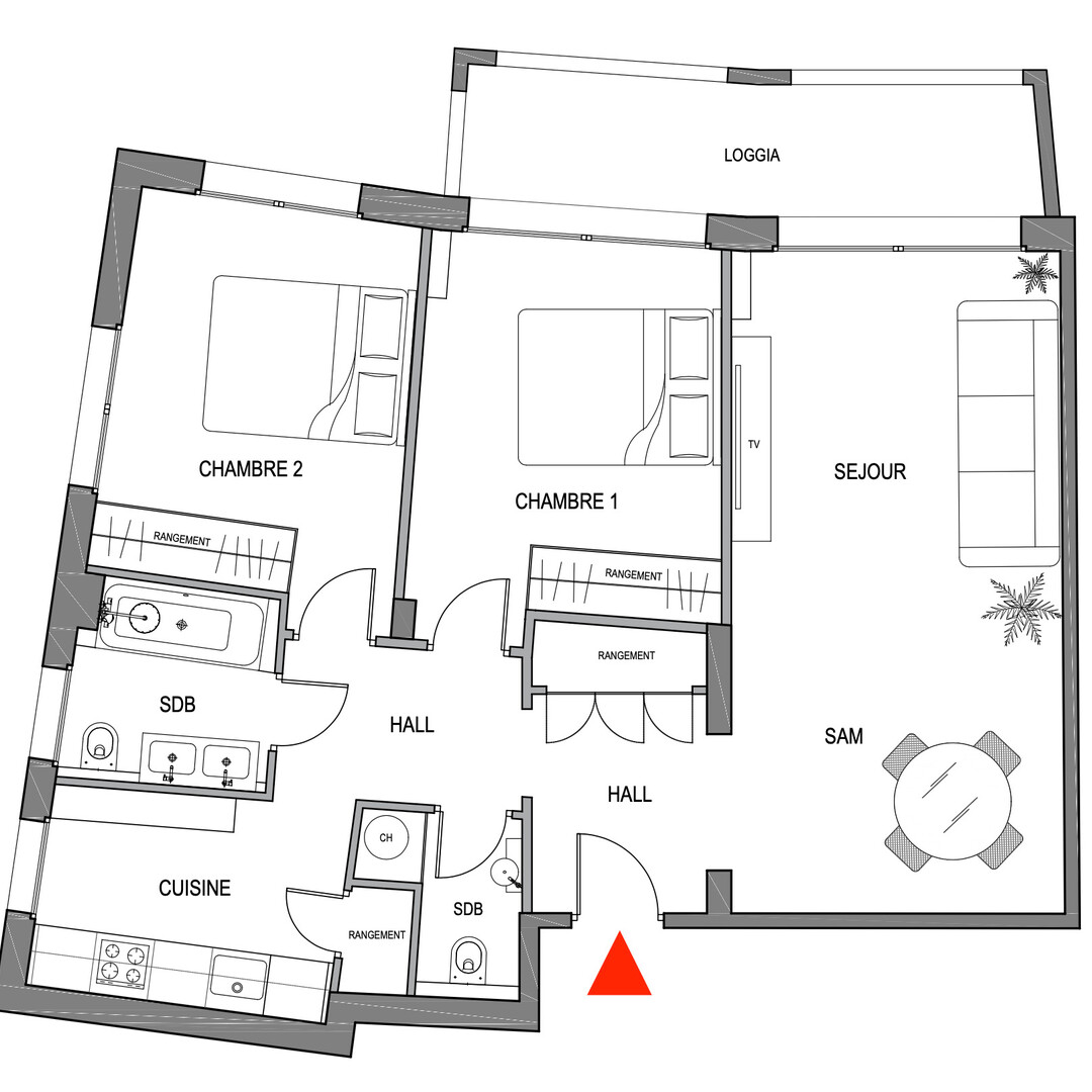 Ingresso, soggiorno, due camere da letto, corridoio, cucina equipaggiata, bagno, servizi ospiti, armadi a muro, aria condizionata, loggia