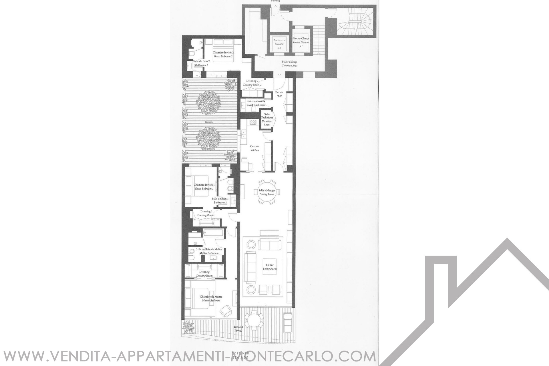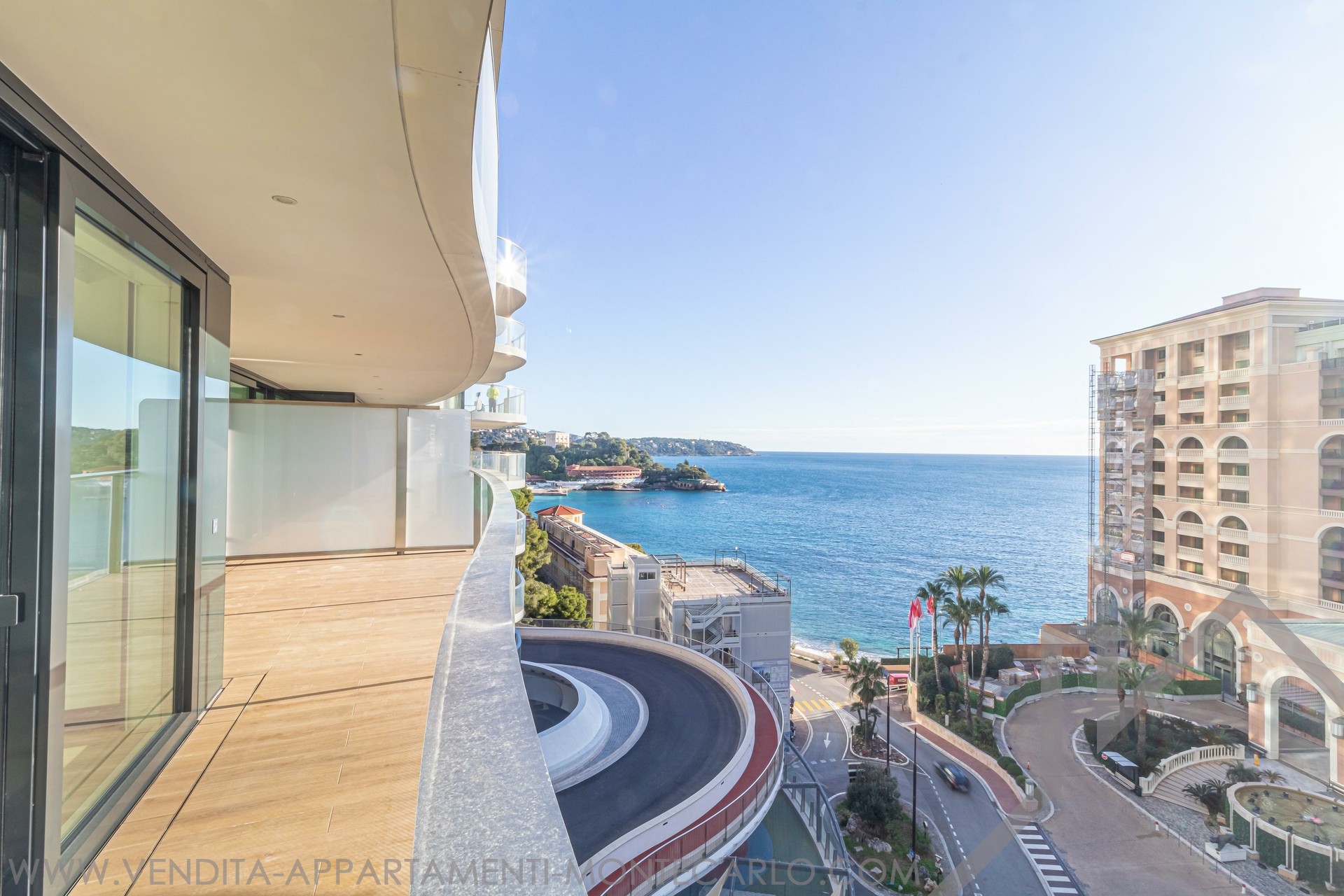Questo sontuoso appartamento con vista mare si apre su un ampio ingresso rivestito in elegante marmo lavorato con precisione, con cornici delle porte in rovere e tiglio; il doppio soggiorno con zona pranzo è dotato di finestre a tutta altezza con porte scorrevoli che si aprono sulla terrazza, permettendo una luminosità ottimale ed una splendida vista sul Mediterraneo. La cucina indipendente, completamente attrezzata con elettrodomestici di ultima generazione. La camera padronale, ornata di lussuosi rivestimenti murali, è dotata di cabina armadio e di un bagno dal design lineare. Due ulteriori camere da letto, ciascuna con bagno privato, si affacciano su un patio. Una cantina e un posto auto completano questa eccezionale proprietà.