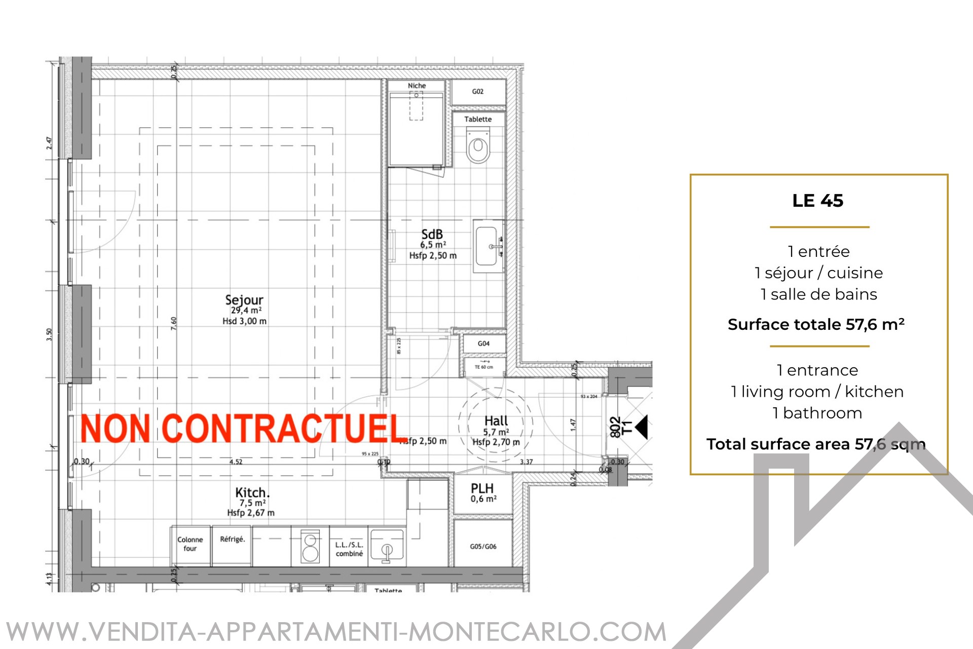 Superficie totale : 57.6 m²