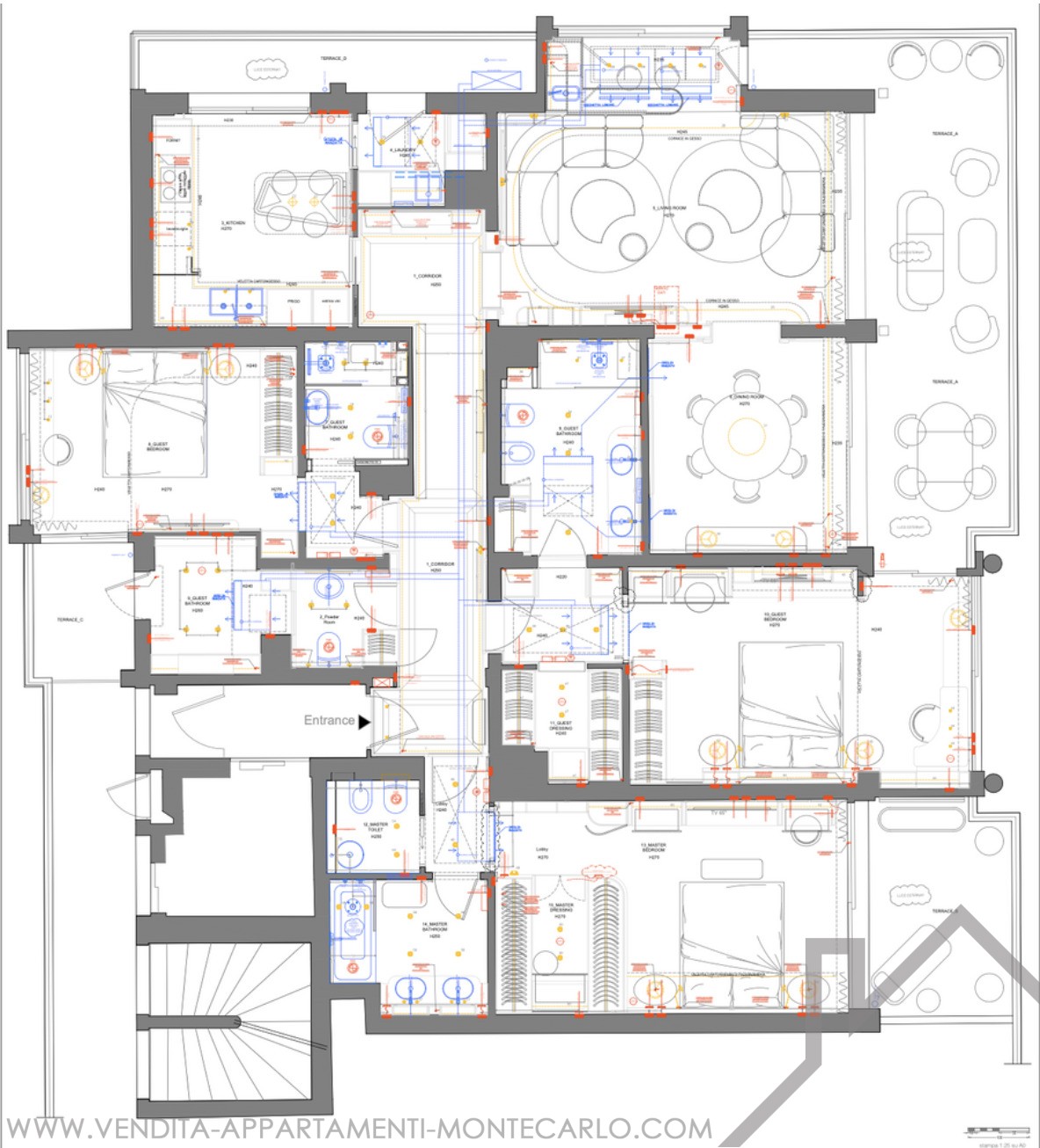 Si compone di tre ampie camere da letto, ognuna con il proprio bagno privato e spogliatoio, un ampio salone doppio con zona pranzo che si apre su una grande terrazza con vista spettacolare sul mare e sul Casinò, oltre a un elegante bar. Una cucina completamente attrezzata con lavanderia privata, una camera per le pulizie e un bagno per gli ospiti completano questo raffinato set.