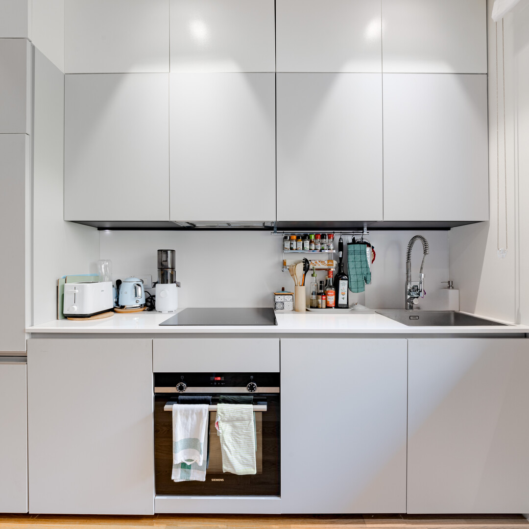 L’appartamento si apre su un ingresso che, sulla sinistra, conduce a un’elegante sala da bagno dotata di WC, lavabo e una moderna doccia all’italiana.