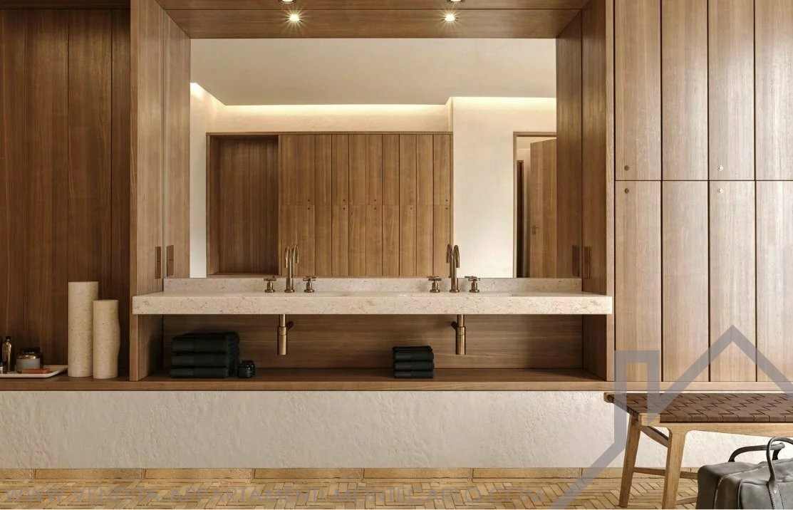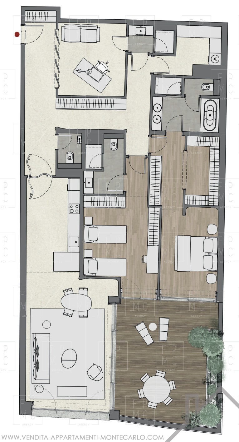Questo appartamento a 3 stanze è composto da un atrio d'ingresso che conduce al soggiorno/sala da pranzo con una cucina aperta, una spaziosa camera da letto padronale con camerino e bagno, una seconda camera con la sua doccia, una dispensa, un bagno per gli ospiti e un camerino. una terrazza.