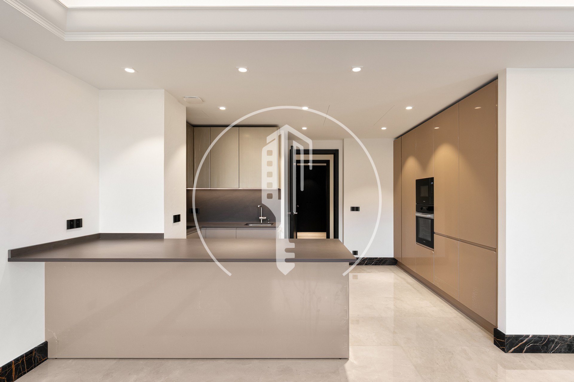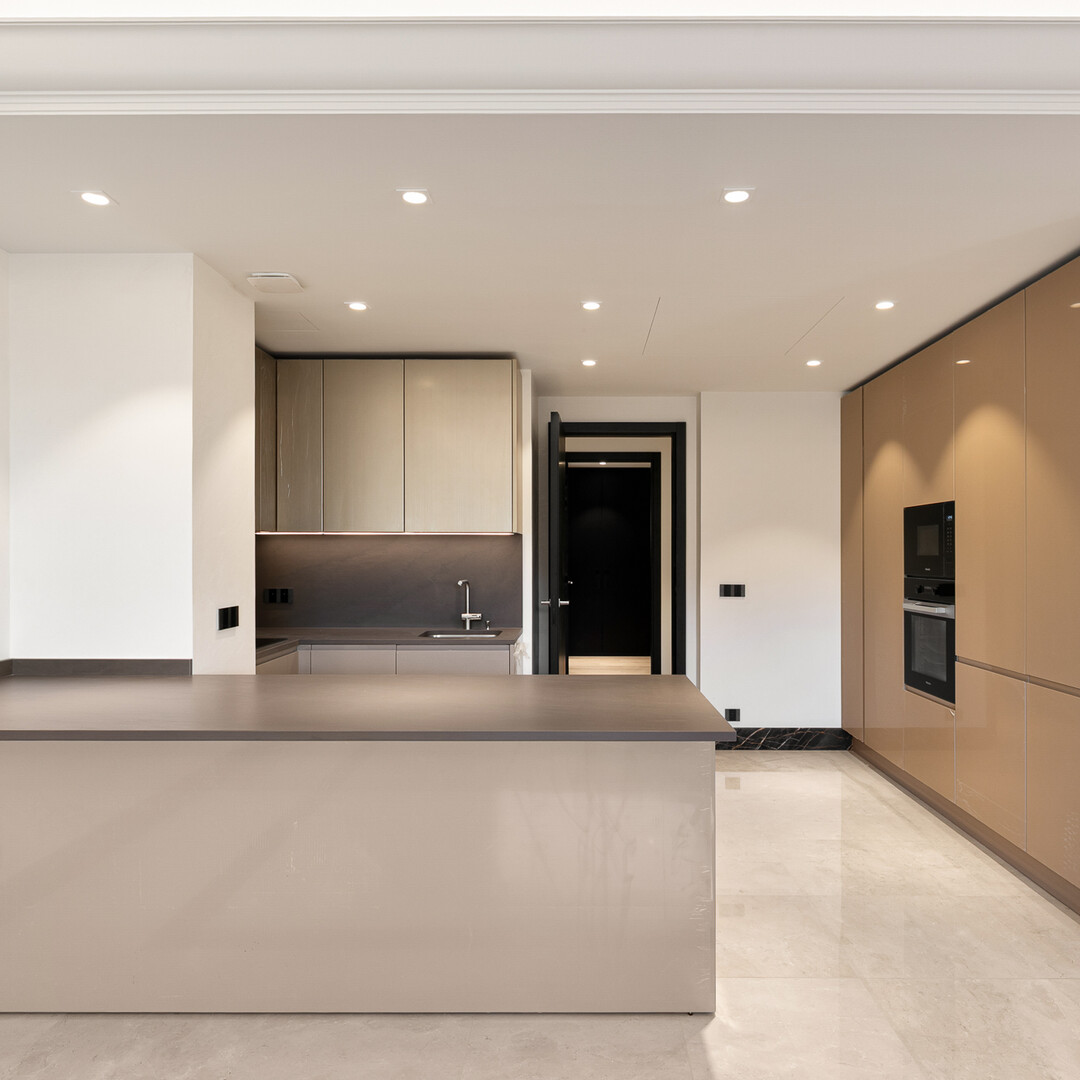 Si compone di un ingresso che conduce a una cucina angolare attrezzata con isola, aperta su un ampio soggiorno con finiture di alta gamma. Il pavimento è in marmo di due tipi diversi e il soffitto presenta una cornice retroilluminata con pareti stuccate.