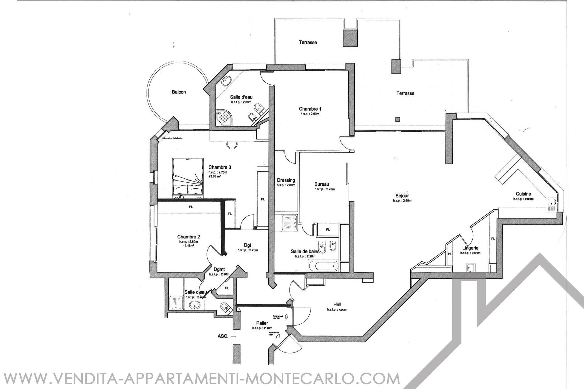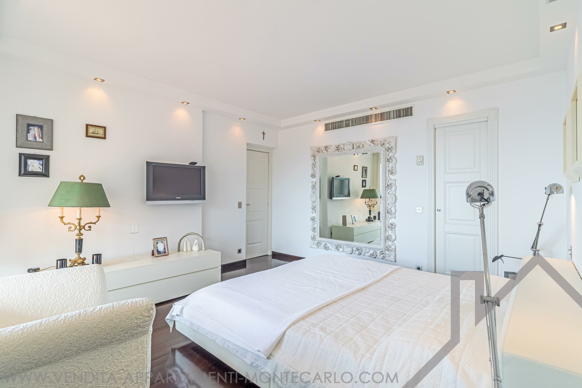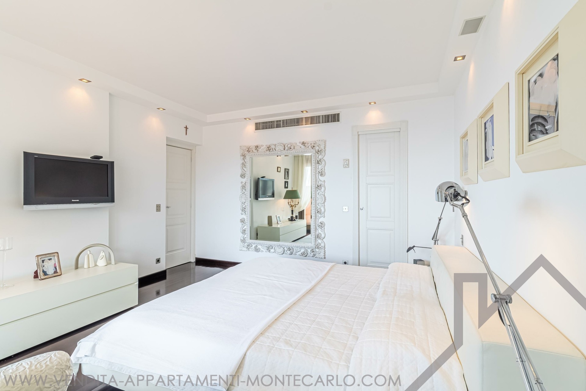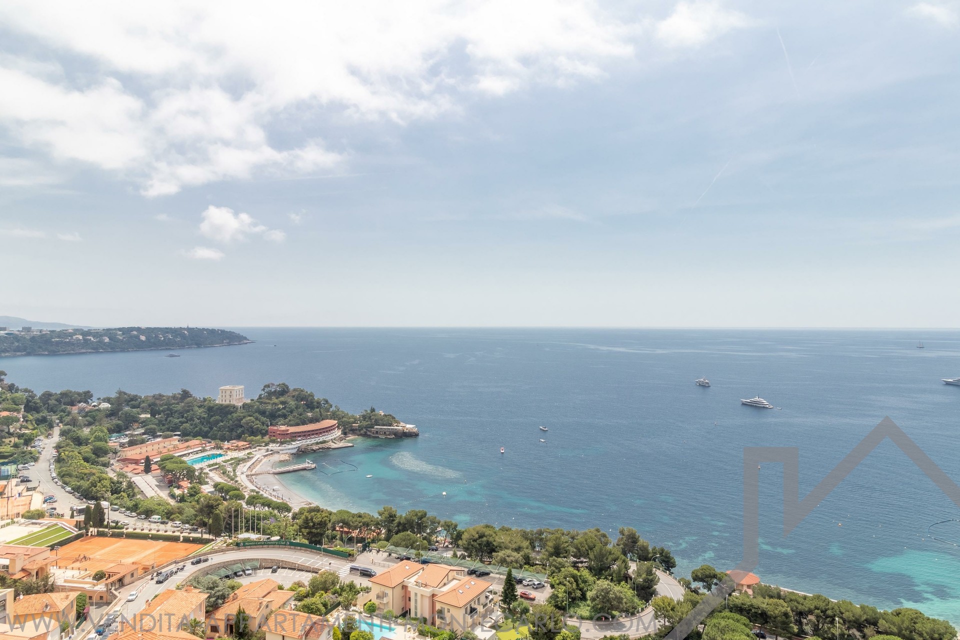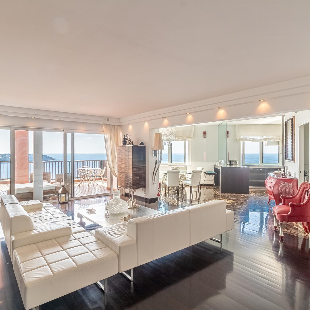 È composto come segue: Ingresso, salone e sala da pranzo con apertura sulla terrazza con vista mare e Cap Martin, cucina attrezzata, lavanderia, ufficio (camera), camera padronale con cabina armadio e stanza da bagno en suite con doccia, ampia camera con apertura su una terrazza circolare, armadi, bagno con vasca e doccia, terza camera con stanza da bagno con doccia.
