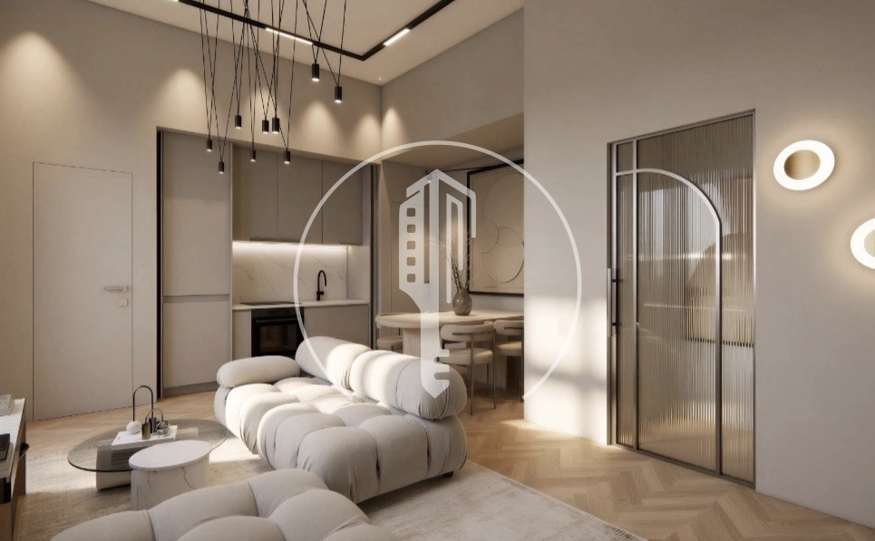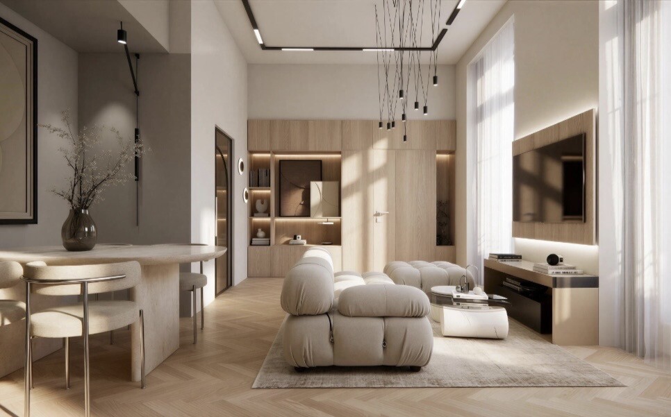 Il soggiorno, immerso nella luce naturale, si apre su un'elegante e perfettamente integrata cucina, ideale per ricevere ospiti in un ambiente chic e accogliente. La stanza, un vero bozzolo, invita a rilassarsi con un'atmosfera calda e sofisticata. Un bagno moderno completa questo set con stile.