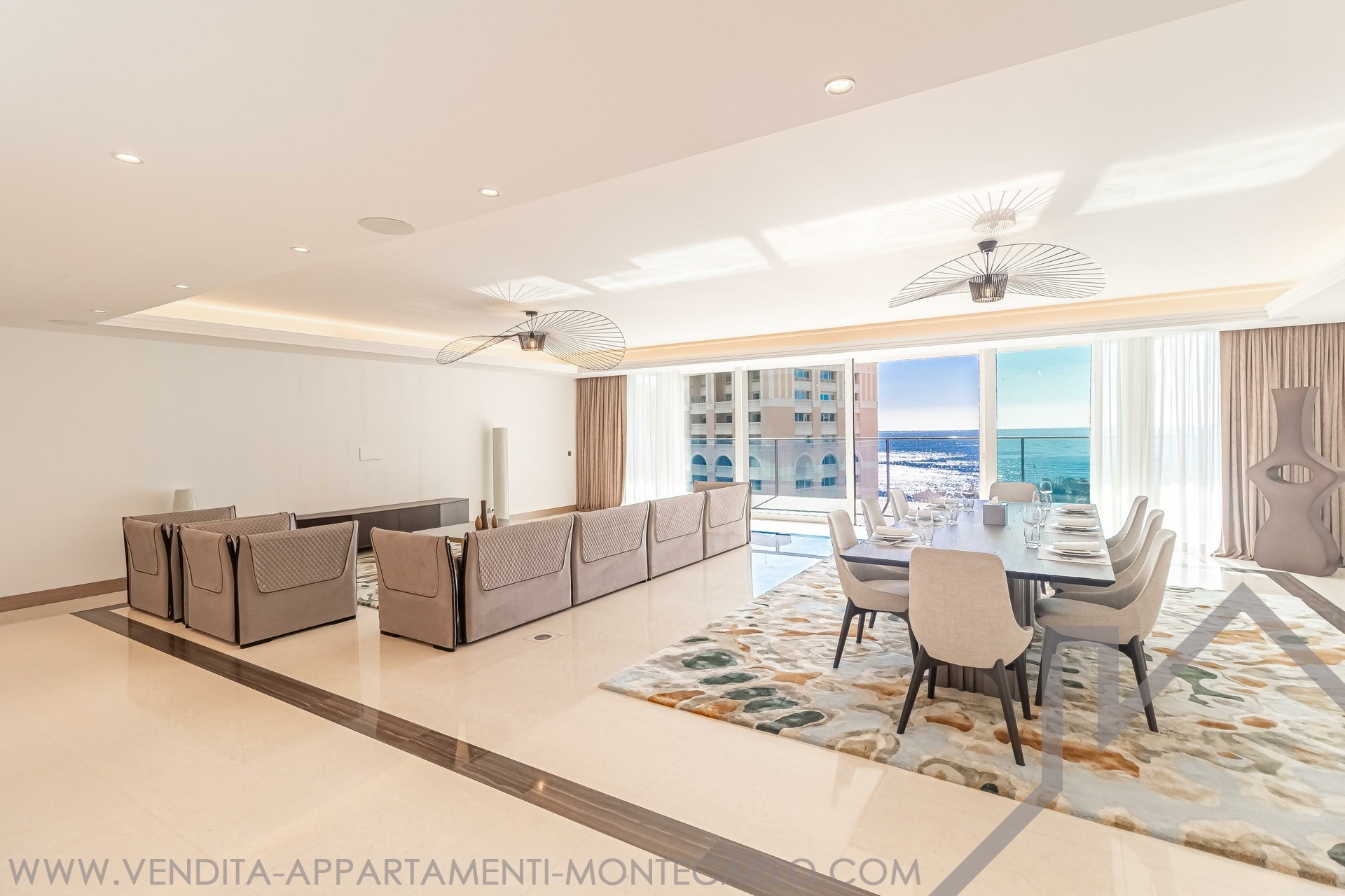 Proponiamo, in questa sontuosa nuova residenza, uno splendido appartamento familiare, impreziosito da eleganti marmi e boiserie in rovere e tiglio, così composto: un ampio ingresso, un doppio soggiorno con zona pranzo, dotato di vetrate a tutta altezza che si aprono sulla grande terrazza, godendo di una luminosità ottimale; una cucina indipendente completamente attrezzata con elettrodomestici di ultima generazione di alta gamma, dotata di angolo pranzo e lavanderia adiacente; una camera padronale con cabina armadio e bagno privato; quattro ulteriori camere da letto, ciascuna con il proprio bagno.