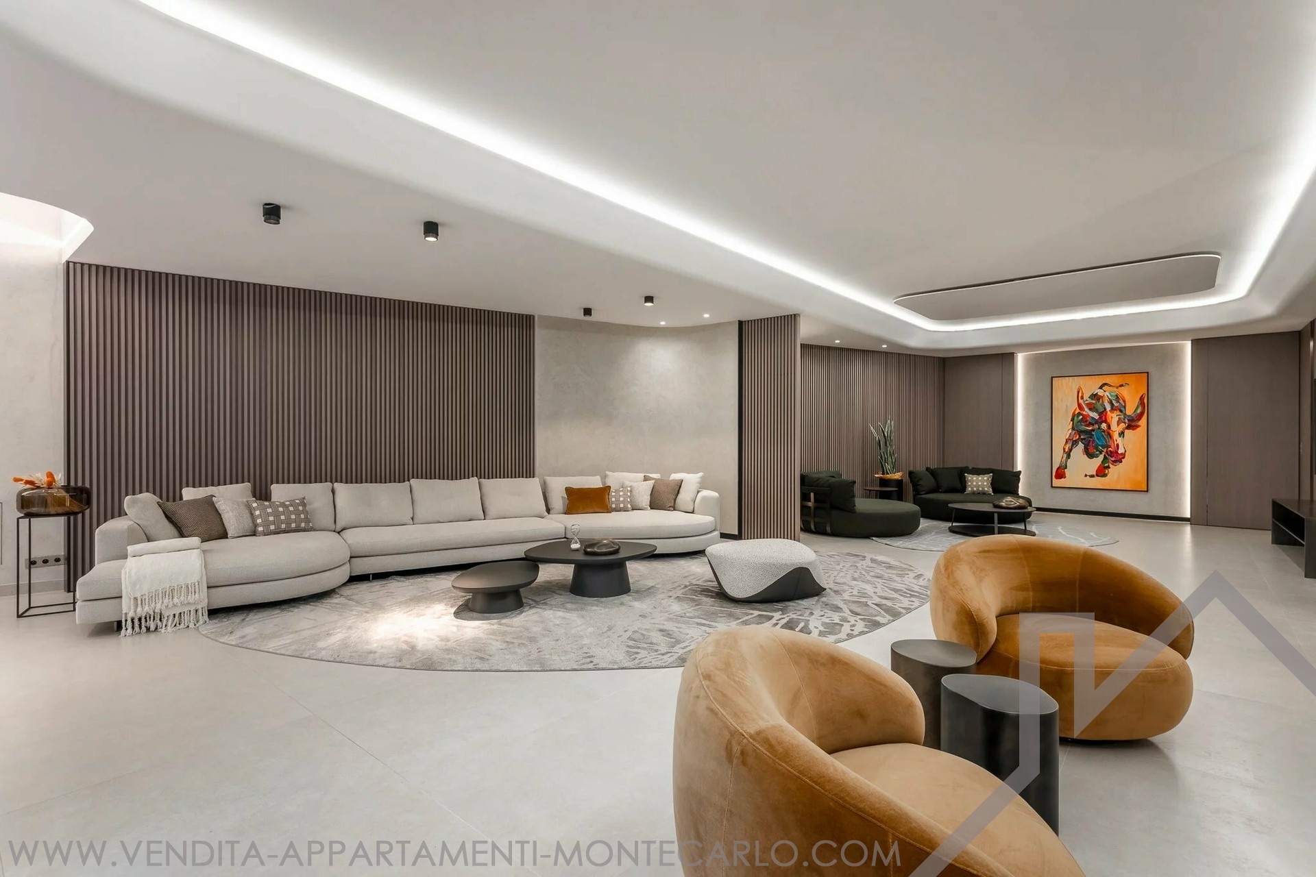 Piano terra: un triplo salone da sogno di circa 300 m², una moderna cucina a pianta aperta, una sala da pranzo e una zona relax con camino, una grande sala TV e una sala fitness.