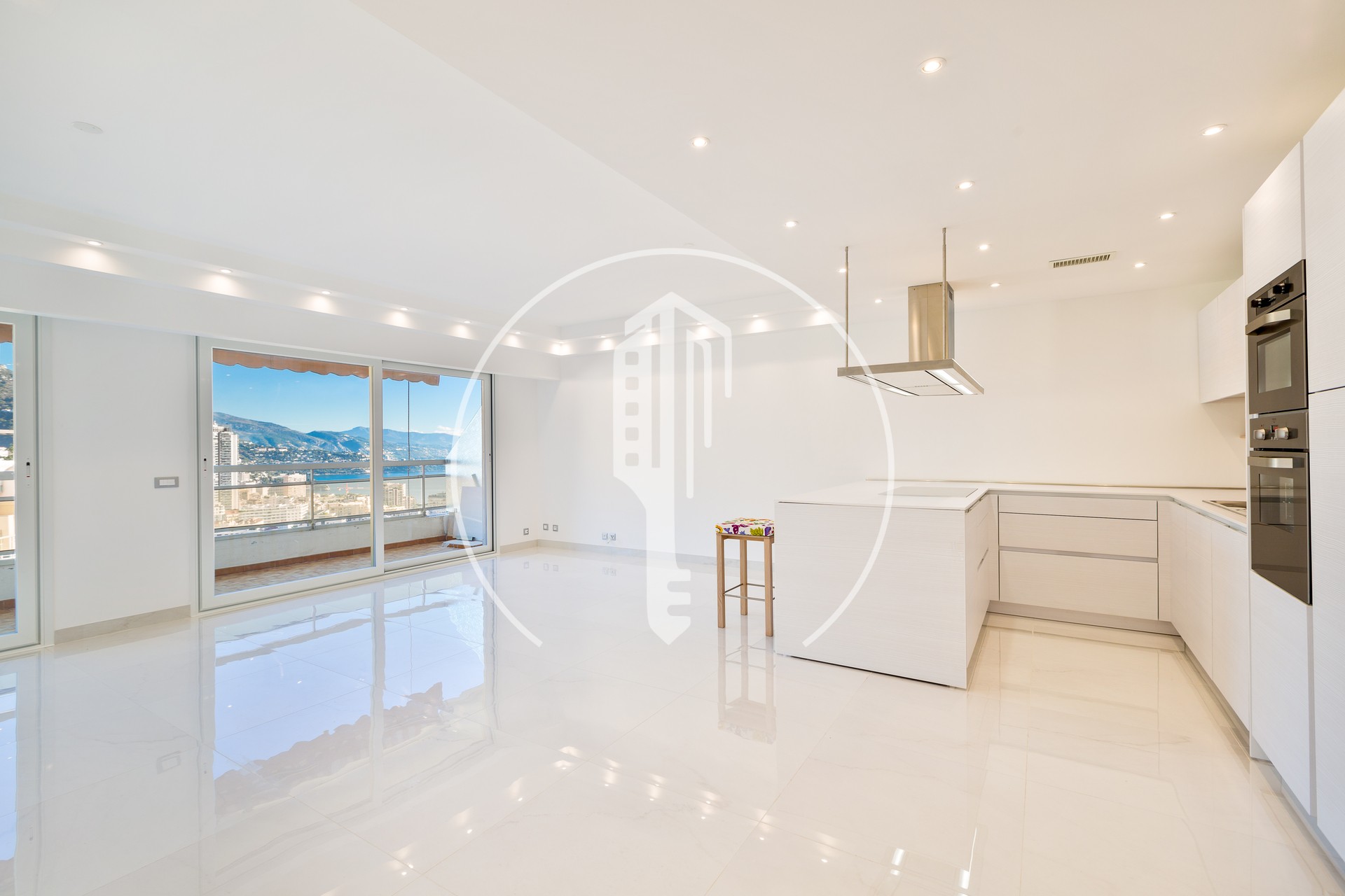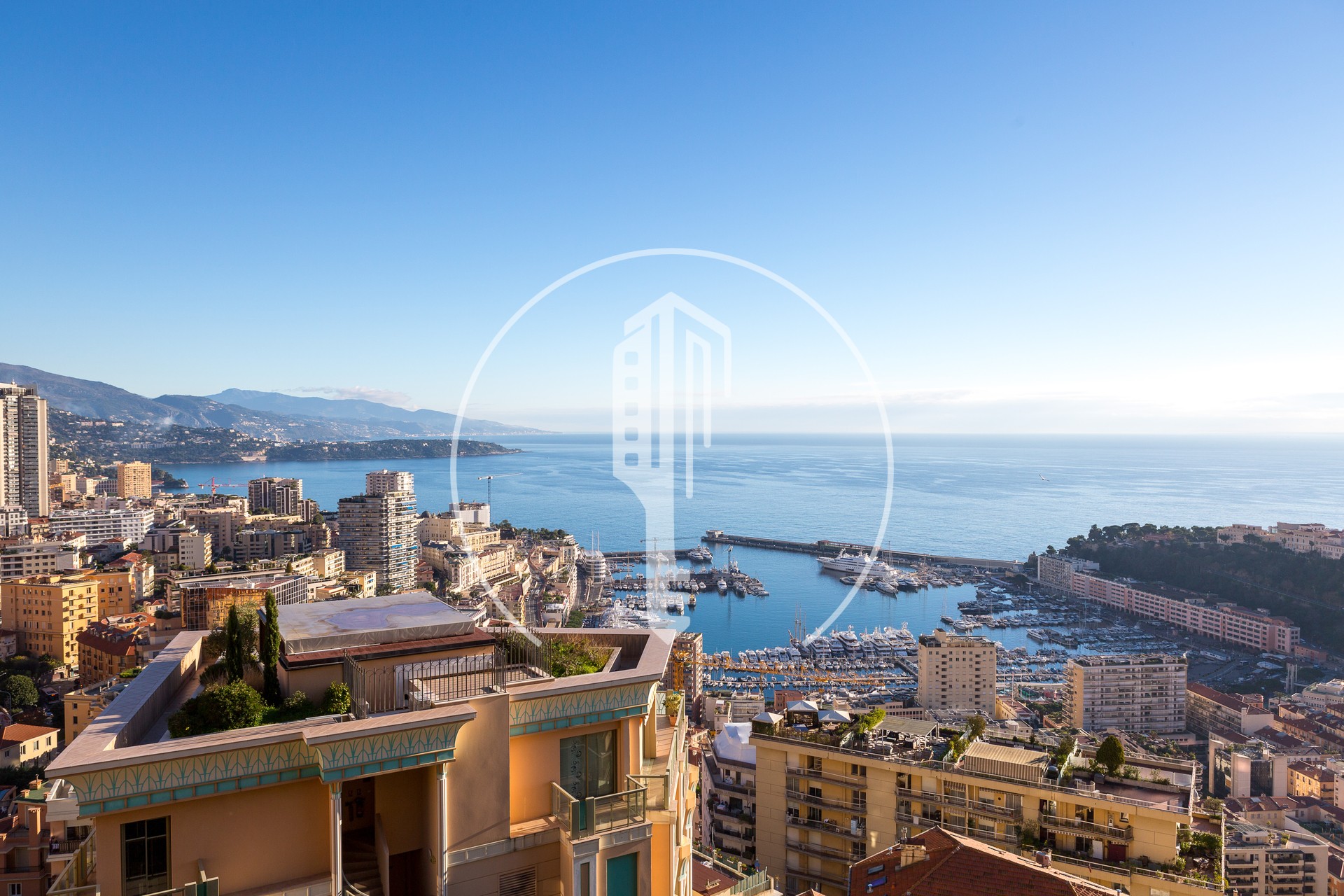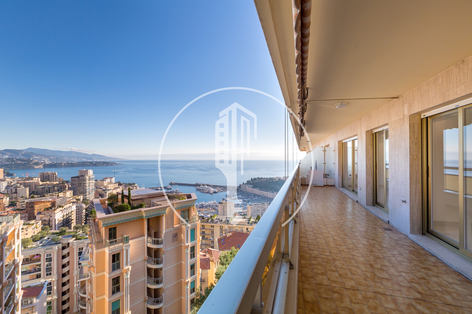 Con una superficie interna di 90,68 mq e una terrazza di 27,70 mq, situato a un piano alto, questo luminoso trilocale gode di una notevole vista panoramica sul mare e sul porto di Monaco.