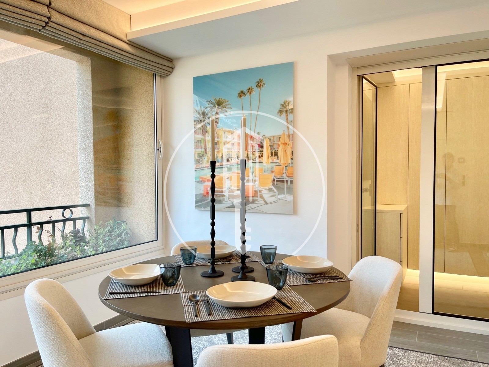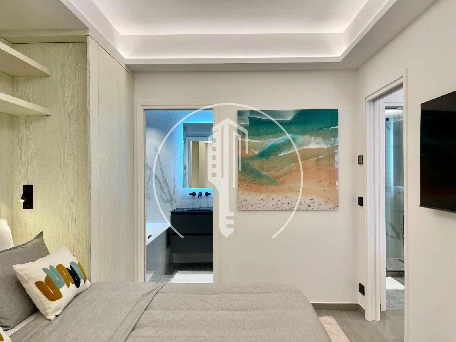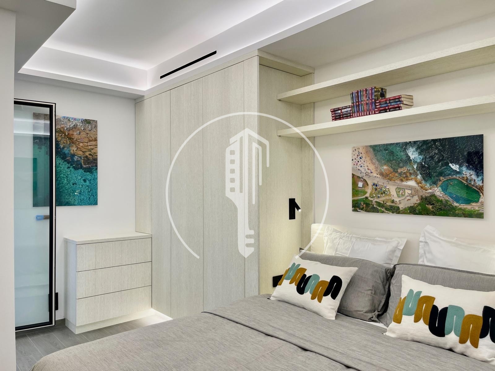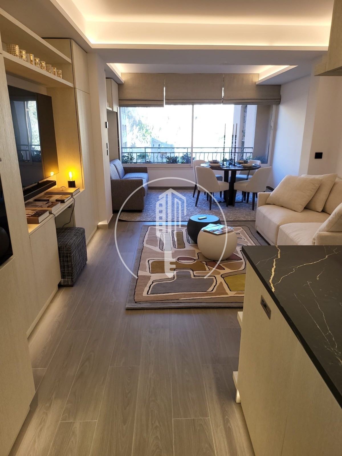 Questo appartamento è composto da un ingresso con deposito e lavanderia integrata, una cucina americana completamente attrezzata aperta su un ampio soggiorno con sala relax e sala da pranzo, oltre a un bagno separato con doccia.